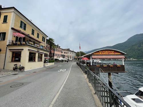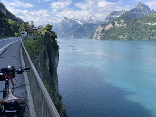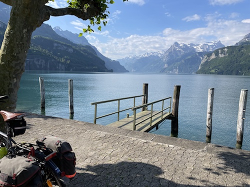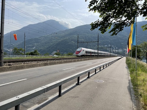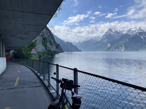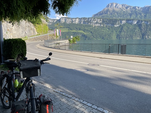 18.23 Uhr – Es rollt sich flach und leicht am See entlang, allerdings auf der Straße, nicht auf dem Bürgersteig. Hier komme ich morgen wieder vorbei und fahre die auf dem Foto zu sehnende Strecke am See entlang in Richtung Gotthard.