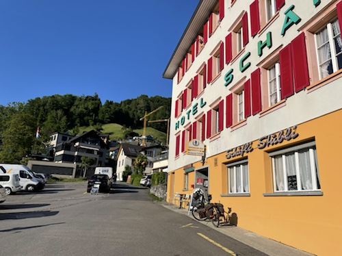 Ab 18 Uhr kann ich im Rössli, auf dem Foto das zweite Haus rechts, zu Abend essen. Ich hätte das halbe Brötchen zur Überbrückung nehmen können, aber ich hebe es mir auf, falls ich nicht satt werde sollte oder morgen nichts beim Frühstück übrig bleibt.