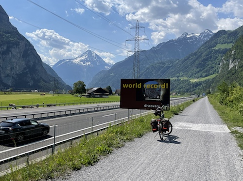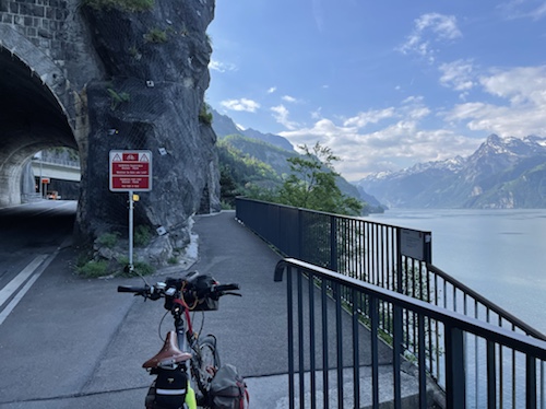 9.41 Uhr – Das Schild fordert Radfahrer auf, die Bahn oder das Schiff zu nehmen, da die Strecke bis Flüelen gefährlich sei. Etwas zu spät, um umzusteigen. Wenn es geht, werde ich Bürgersteig fahren.