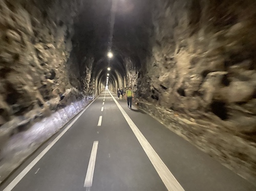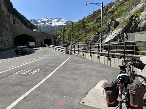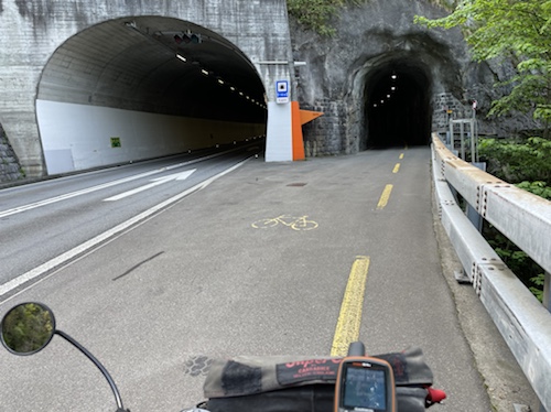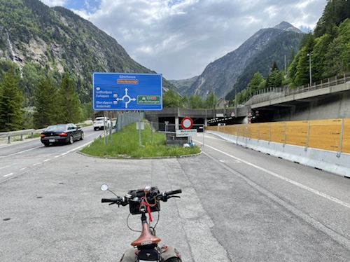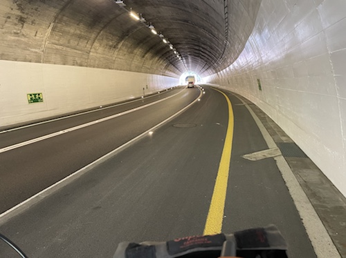 Hier ist also die Einfahrt in den nur zweispurigen 16,5 Kilometer langen Tunnel. Eine zweite Röhre ist in Bau und soll 2029 fertig sein, stand vorhin auf einem großen Schild.