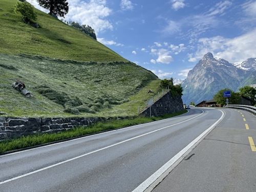 9.33 Uhr – Auf Kilometer 8 in Brunnen. Herrlich! Links steigt die Straße in die Felswand. Der Tacho zeigt schon 26° C. Ich fühle mich nicht wirklich voller Kraft. Also langsam machen, etwas trinken, ein Bonbon lutschen, dann weiter.