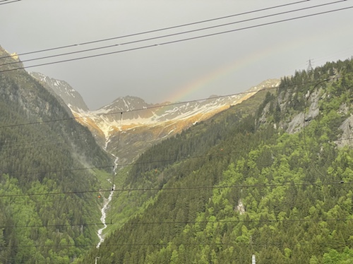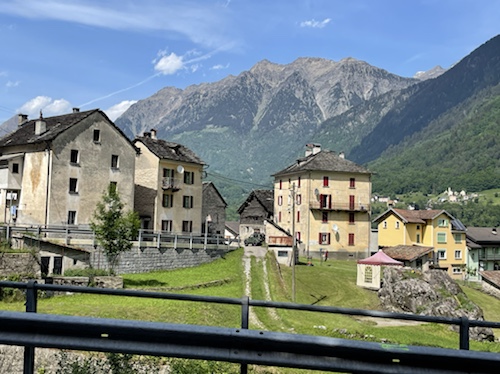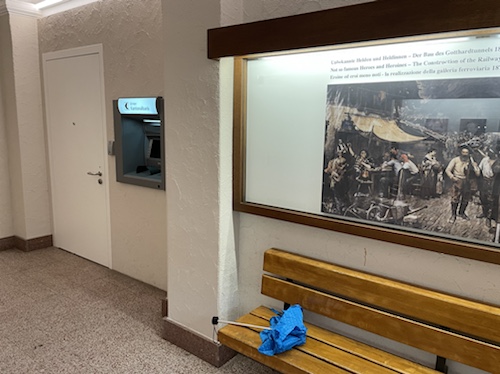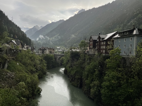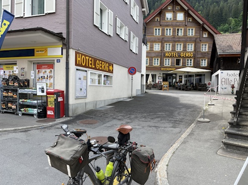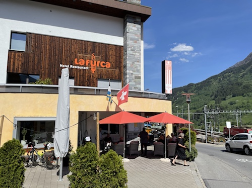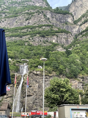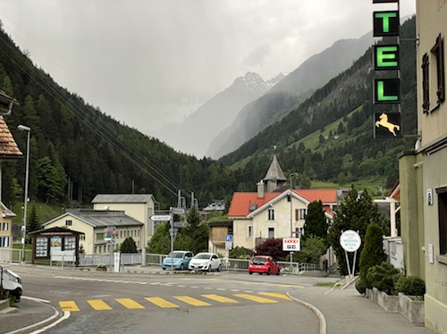 15.35 Uhr – In Wassen sprang mir quasi diese Lokal entgegen. Kaffee, Limo und Quatschen mit Weitwanderern waren sehr stärkend und entspannend. Sie sind auf dem Weg von Basel nach Chiasso. Er hat seit dem ersten Tag große Blasen und fährt Bus. während sie 25 bis 30 Kilometer läuft. Die heutige Etappe ging bis Göschenen. Da sie aber das Hotel hier in Wassen schon gebucht hatten, sind sie mit dem Bus wieder zurück. In Morcote, wo ich in drei Tagen sein will, soll ich mir die Kirche und den Friedhof unbedingt anschauen. Sie kommen in einer Woche dort an.