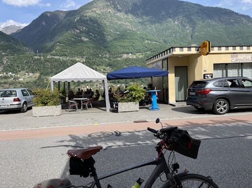 Es sind schon drei weitere Radfahrer mit drin. Ich sitze am Tisch mit Blick auf meine Rosinante.