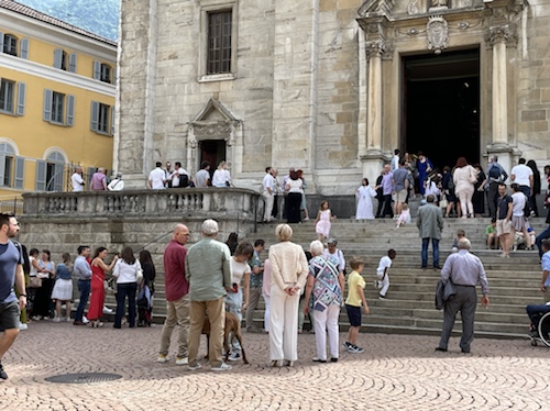 15.07 Uhr – Wir sind alle draußen. Links die jungen Leute fahren mit dem Zug nach Verona, dann über Gotthard, Furka und Grimsel nach Lörrach.