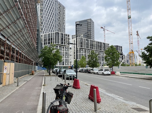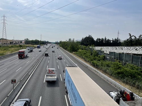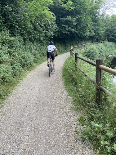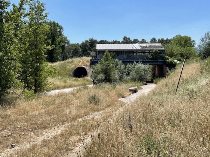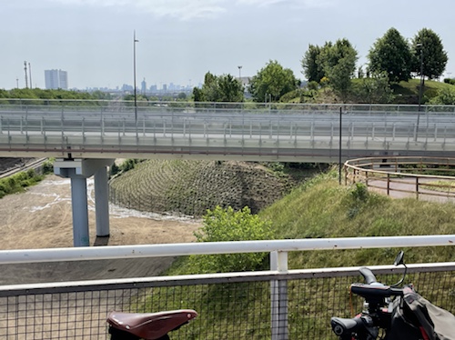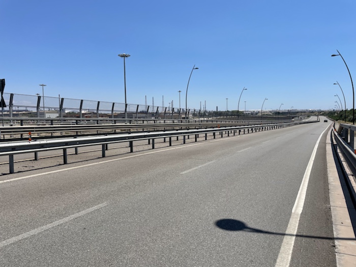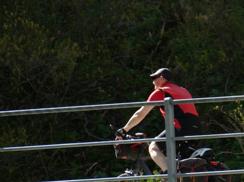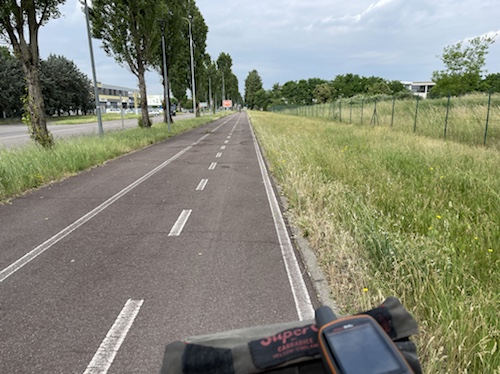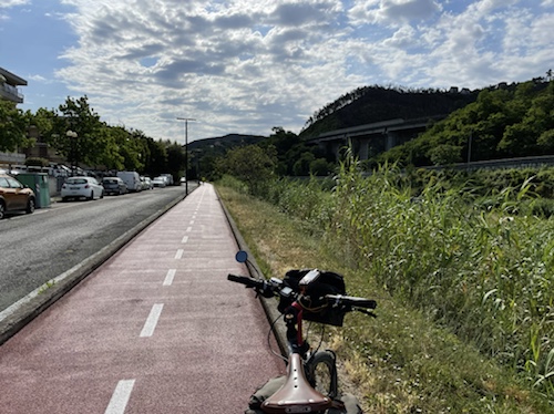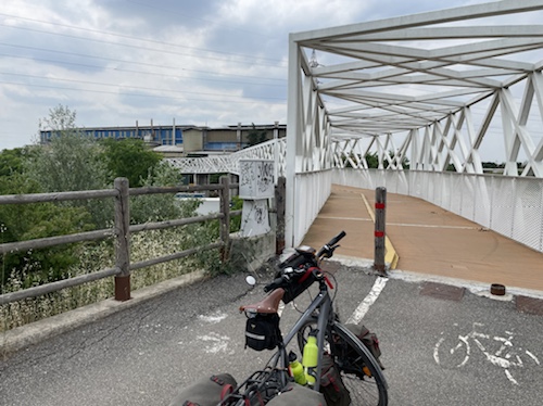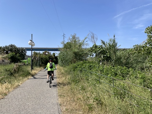 9.53 Uhr – Kilometer 10. Die Abfahrt auf der Straße war mit über vierzig km/h sehr schön. Jetzt wird der Radweg außen an einer langen Galerie entlang geführt. Auch prima zu fahren.