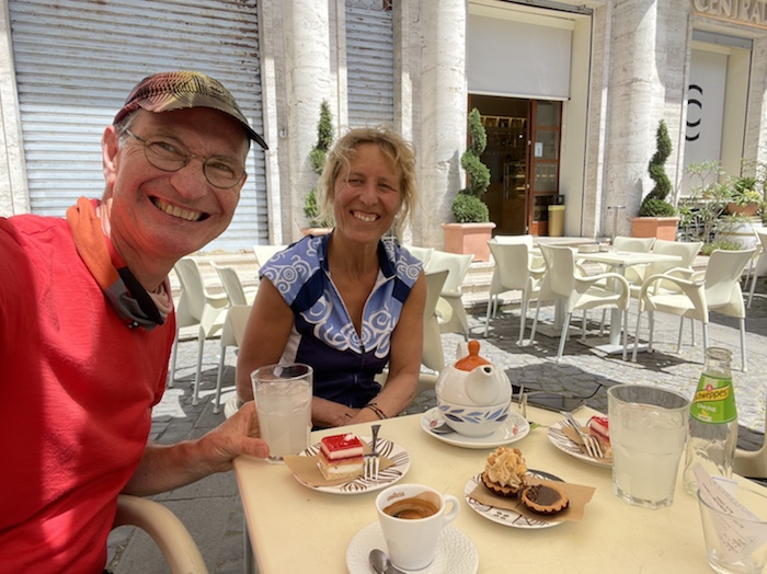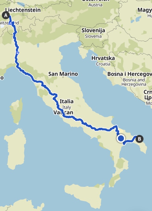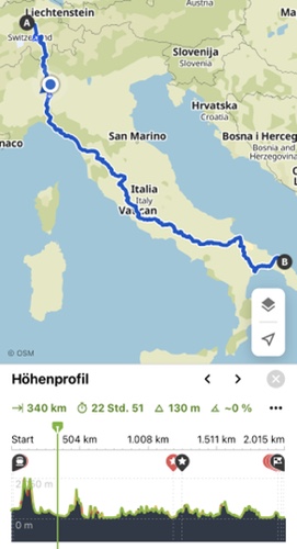 31. März 2022 – Martina aus Wiesbaden wird mich auf dem mittleren Abschnitt meiner Tour begleiten. Ich treffe sie abends am 4. Juni in Chiusi am Bahnhof. Wir fahren zusammen bis Bari an der Adria. Zum ersten Mal werde ich also nicht nur ein paar Stunden, sondern über mehrere Tage in Begleitung fahren. Ich bin sehr gespannt, wie sich mein auf Alleinreisen eingespielter Tagesablauf und mein Fahr-, Pausen- und Blog-Stil dadurch ändern wird. Ich freue mich schon sehr auf diese neue Erfahrung.