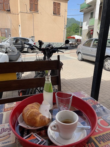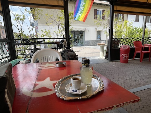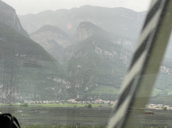 14.36 Uhr – Nächster Halt ist Bologna. Über den nördlichen Apennin zieht Regen heran. Ich habe mich mit dem Provence-Krimi abgelenkt. Und einen Joghurt mit Haferflocken und einen Apfel gegessen. Mit dem dritten Caffé aus der Maschine bin ich wach genug für das Umsteigen in Bologna, denke ich.