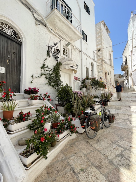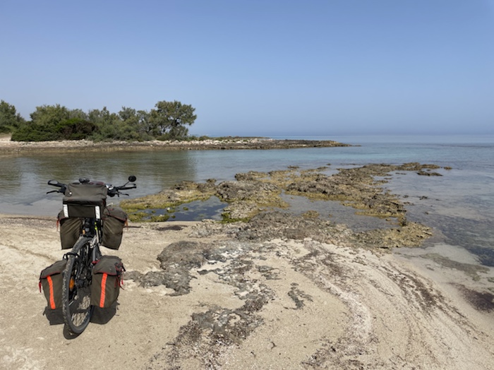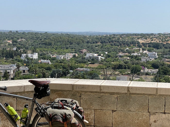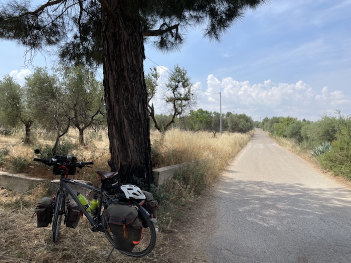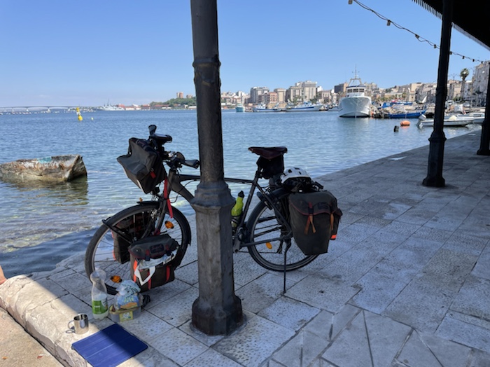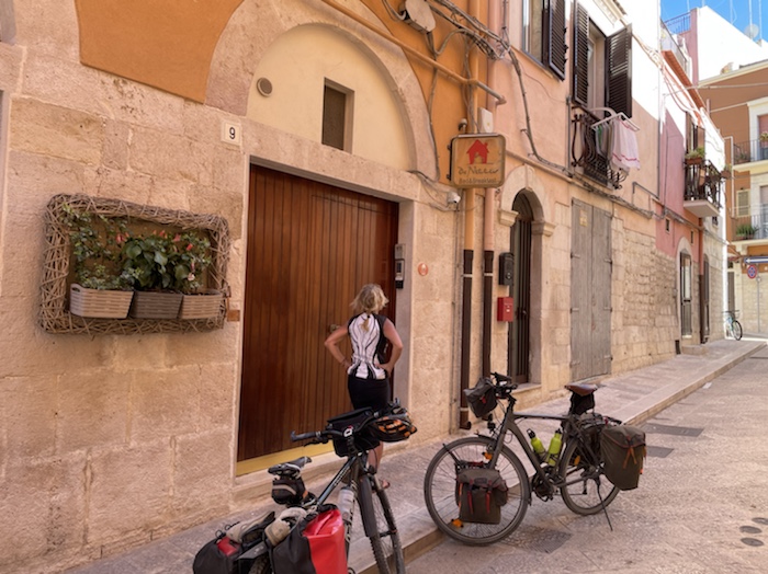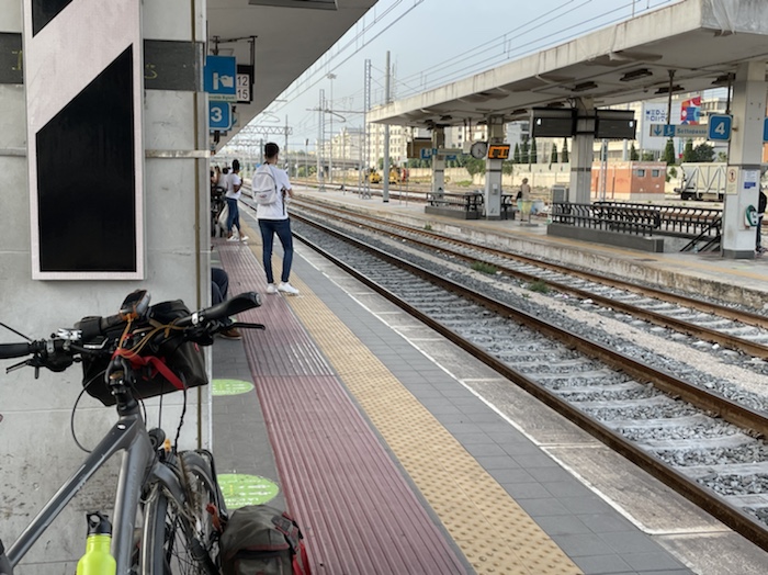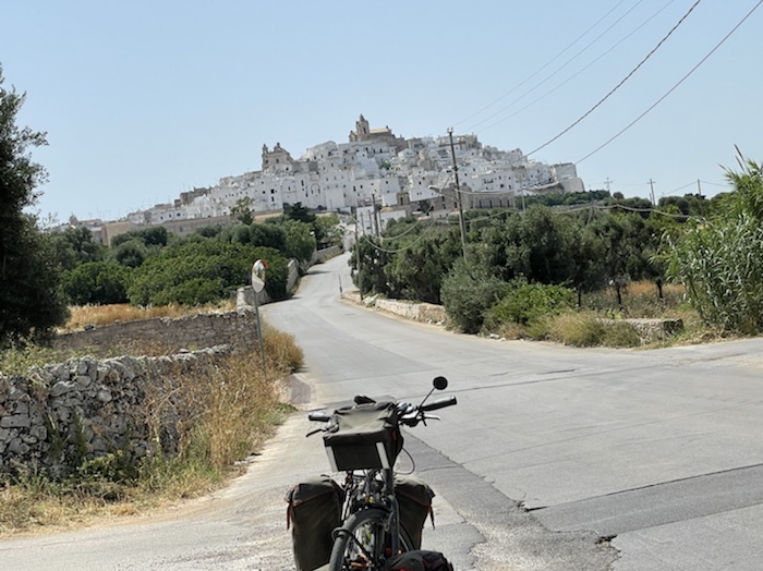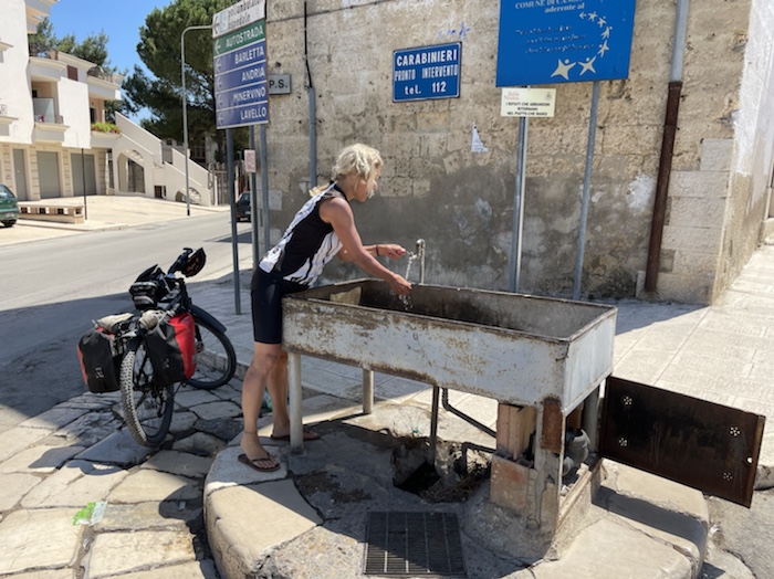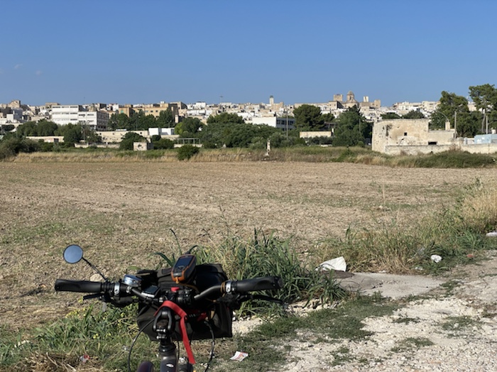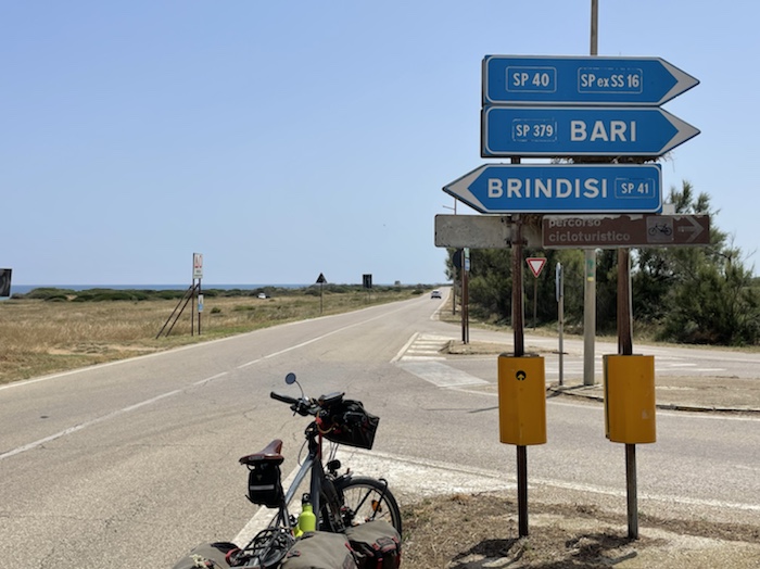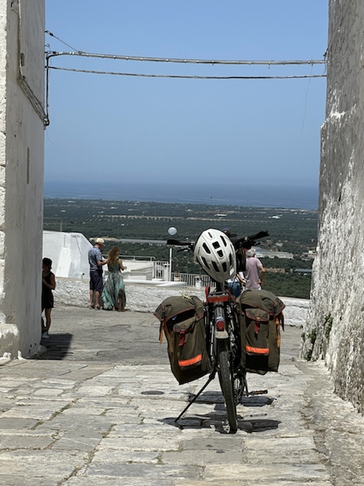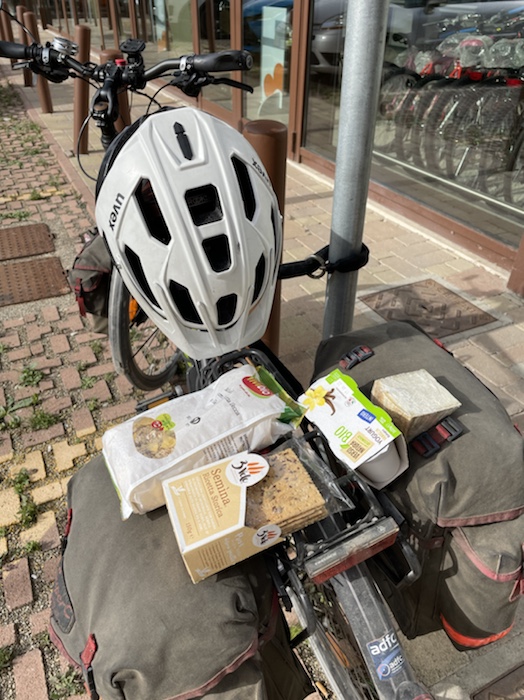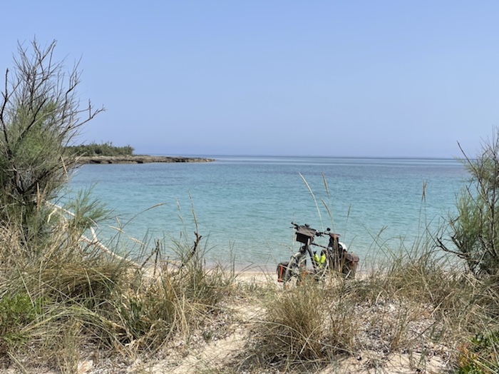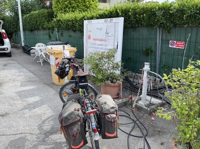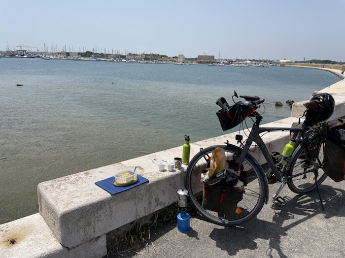 Ich habe zwei jungen deutschen Bike-Packern beim Einsteigen geholfen. Sie haben mich wohl vorgestern in Ostuni gesehen und konnten sich an meine grünen Wasserflaschen erinnern.