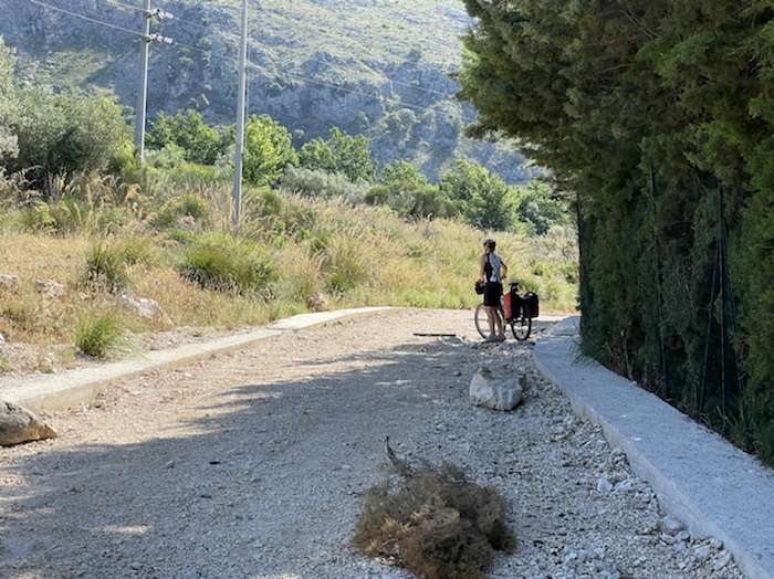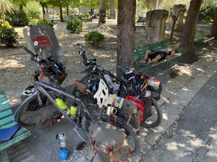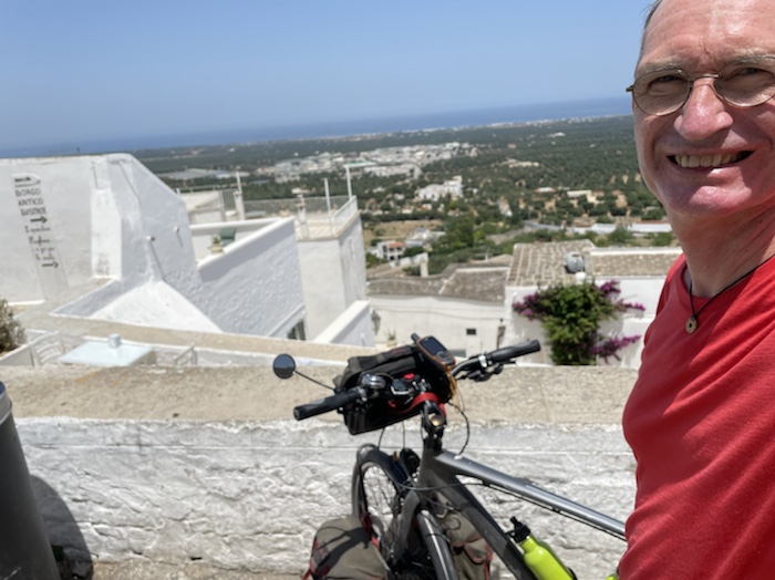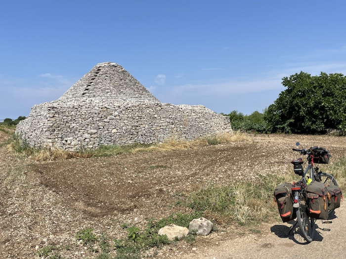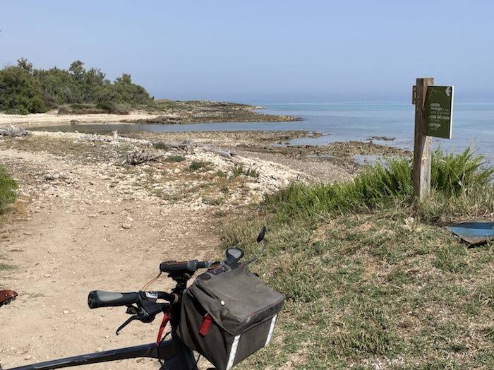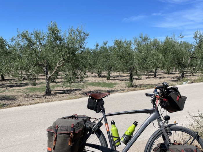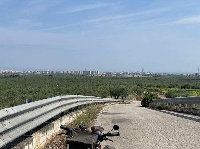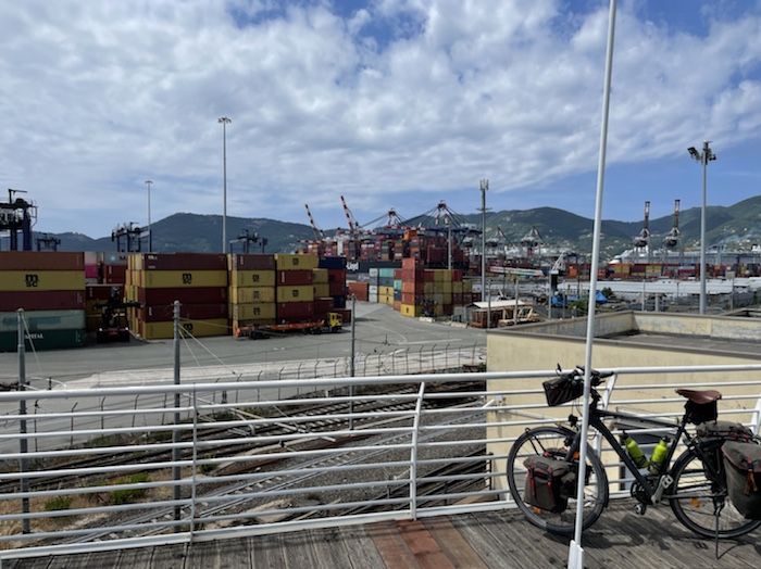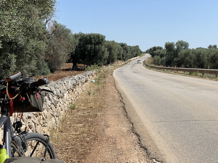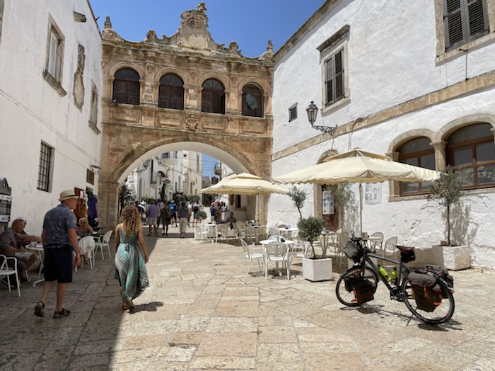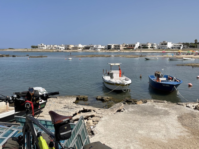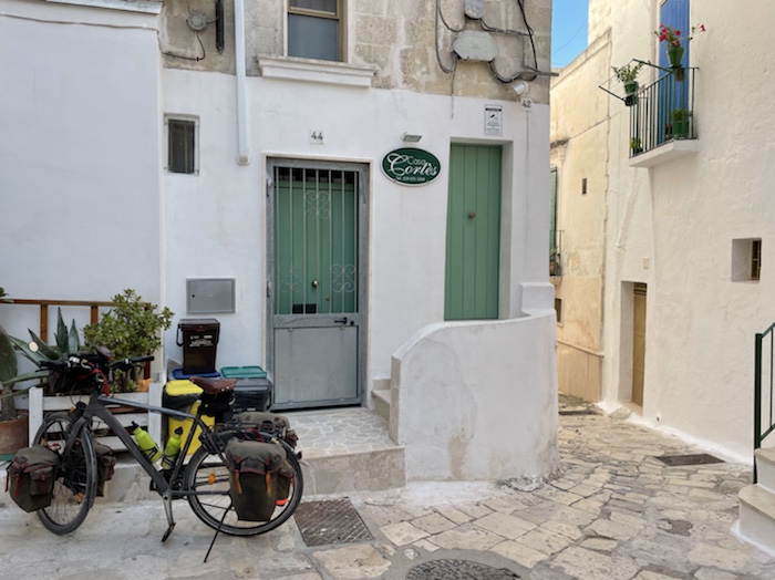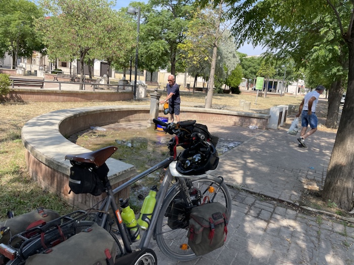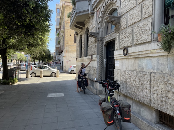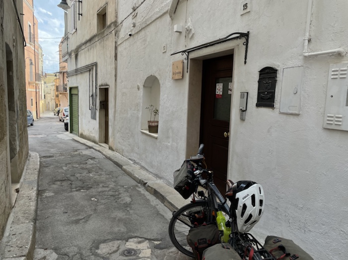 Ich habe zwei jungen deutschen Bike-Packern beim Einsteigen geholfen. Sie haben mich wohl vorgestern in Ostuni gesehen und konnten sich an meine grünen Wasserflaschen erinnern.