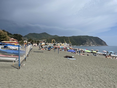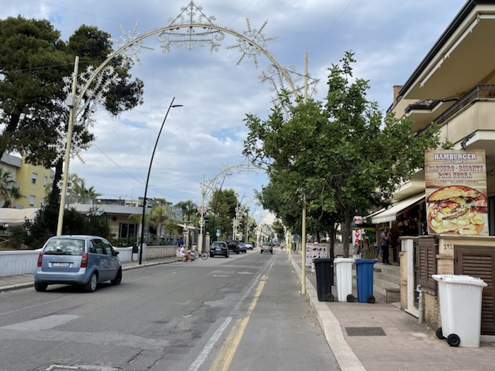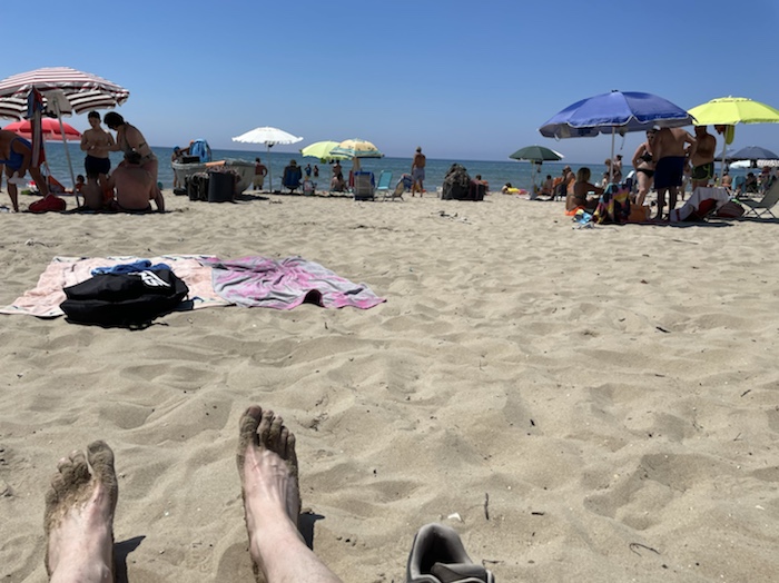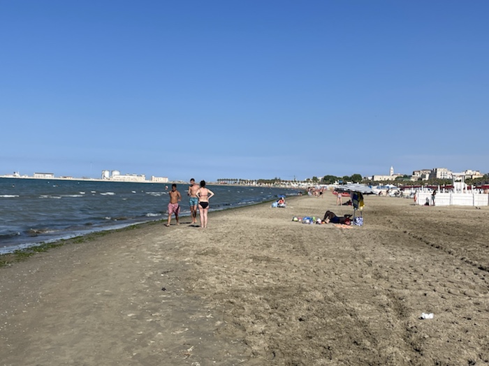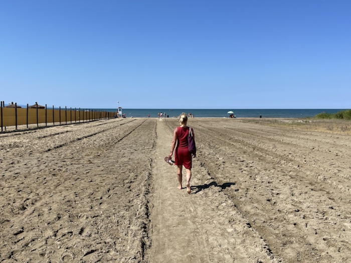 Vor Campomarino fahren wir an einem langen Naturstrand mit Dünen entlang. Es ist diesig draußen. Wegen der Klimaanlage ist nicht zu schätzen, wie warm es draußen ist.