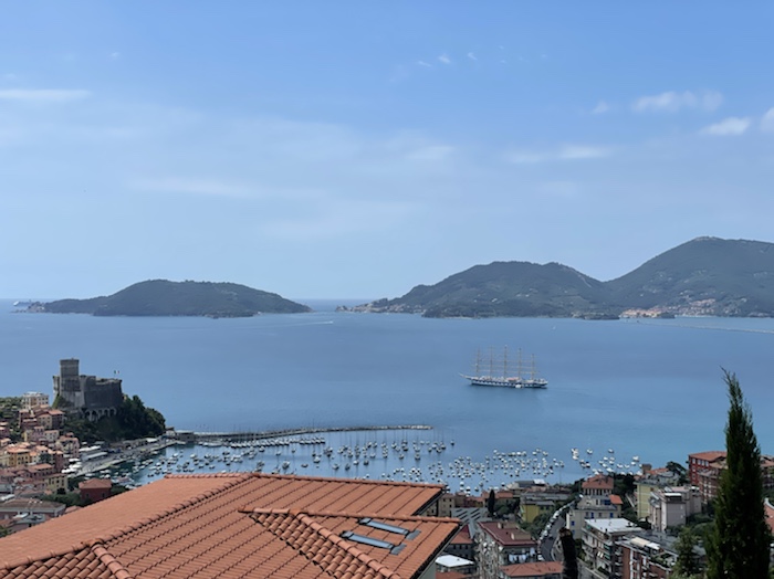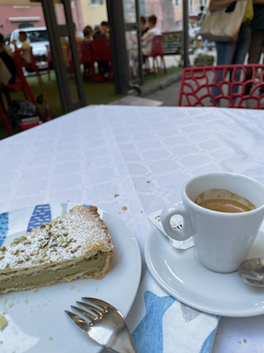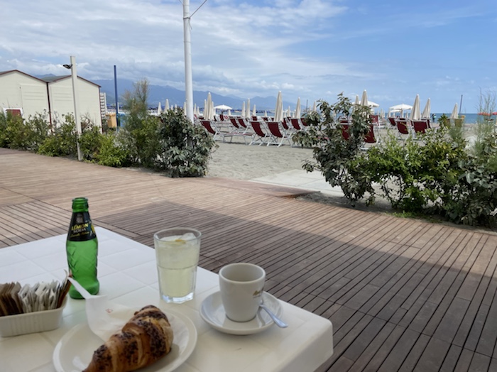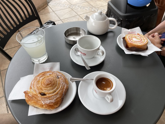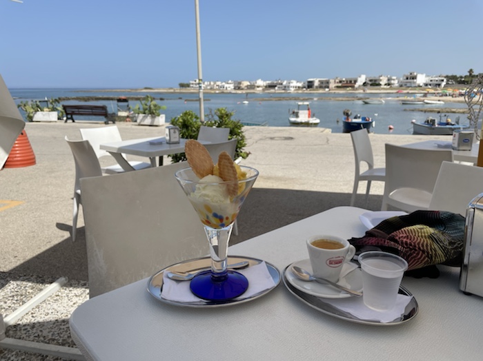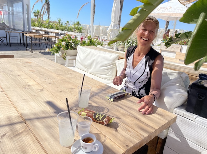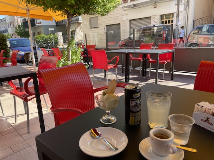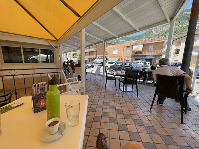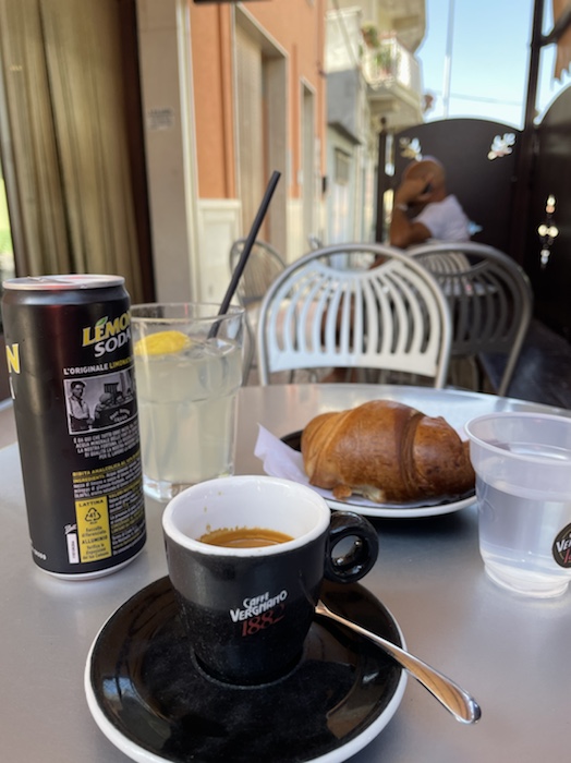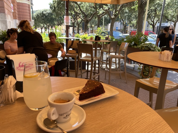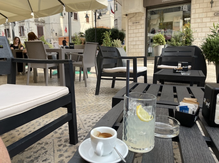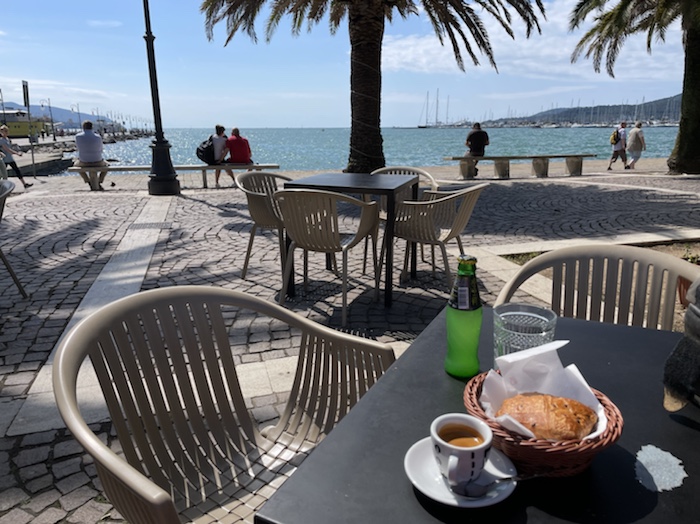 14.35 Uhr – Nun Caffé und Limonade an einer Seitenstraße mit Sicht auf ein Fährschiff und das Hafenbecken. Die Dame in weißer Uniform ist sicher im Marine-Business.