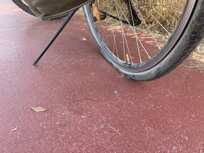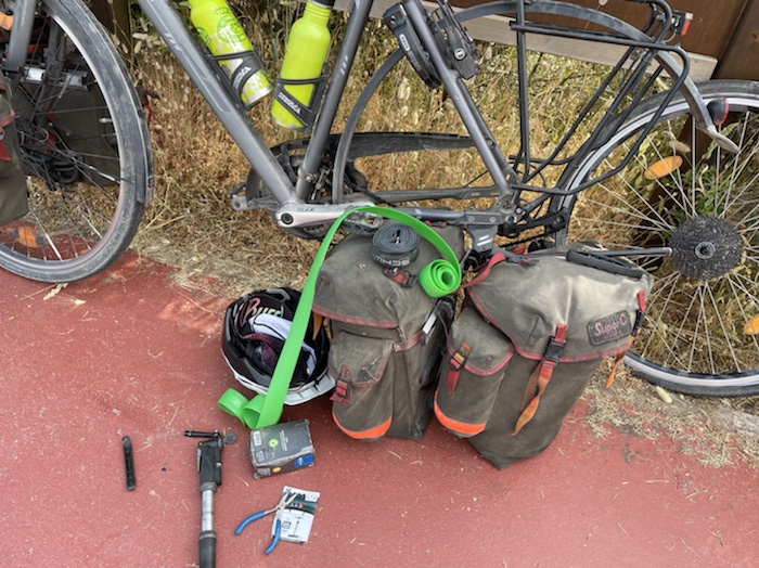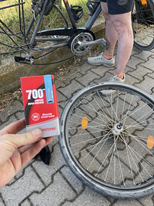 Nach dem ersten Platten auf einer Radreise steige ich wieder auf normale Marathon-Reifen plus Pannenschutzeinlage um. Ich habe sie ja jetzt. Neue Handschuhe für die Kettenpflege sollte ich einpacken, die alten waren schon durchgescheuert.