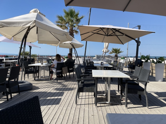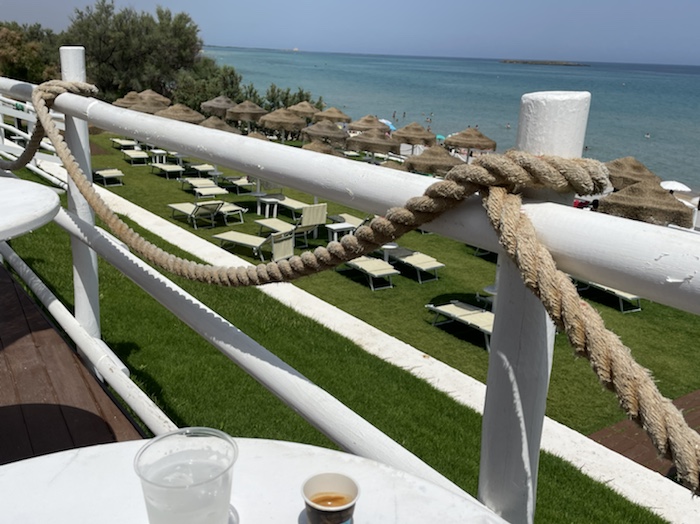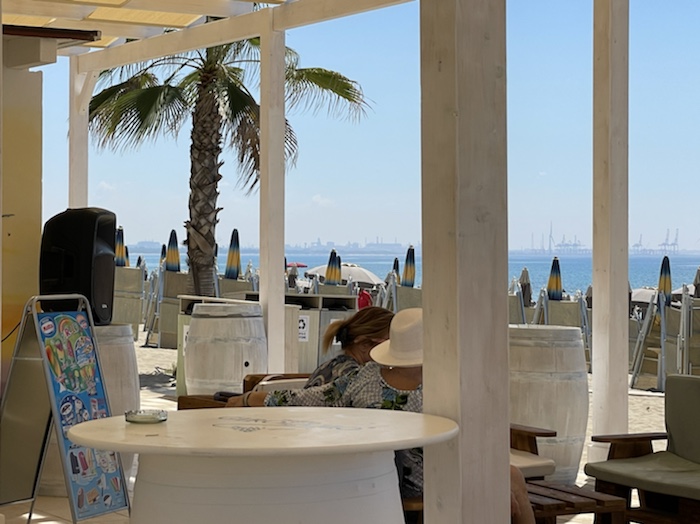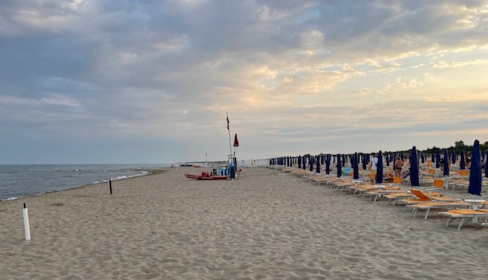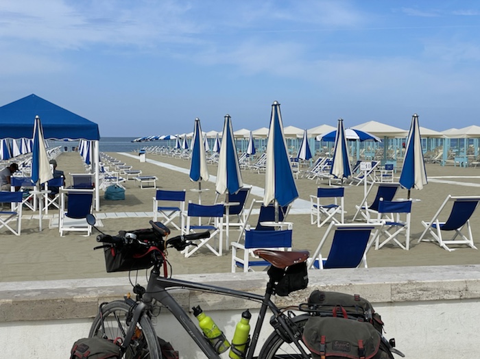 10.14 Uhr – Wir fahren aus Termoli hinaus. Hier stehen die Strandschirme dicht an dicht. Das Wasser ist flach, wie in einer Schüssel.