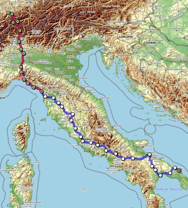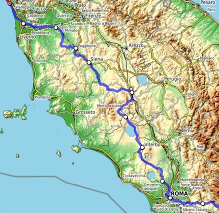 Es ist März und seit zwei Monaten sitze ich immer mal wieder an der Planung für die diesjährige Radtour. Im Grunde stand die Planung für eine Italientour auf dem EuroVelo 5 entlang der Via Romea Francigena ja letztes Jahr im April schon. Ich habe dieses Jahr mehr Zeit und konnte die Tagesetappen etwas verkürzen. Ausserdem habe ich die Besuche von Saturnia und dem Tarot Garten der Niki de Saint Phalle sowie den Monte Amiata aus der ursprünglichen Planung wieder herausgenommen. Es bleiben als Extras die touristischen Highlights Cinque Terre und Pisa sowie die Stauferfestung Castel del Monte, die ich zusätzlich zu den unzähligen am Weg der Via Romea Francigena liegenden kulturellen Attraktionen besuchen möchte.