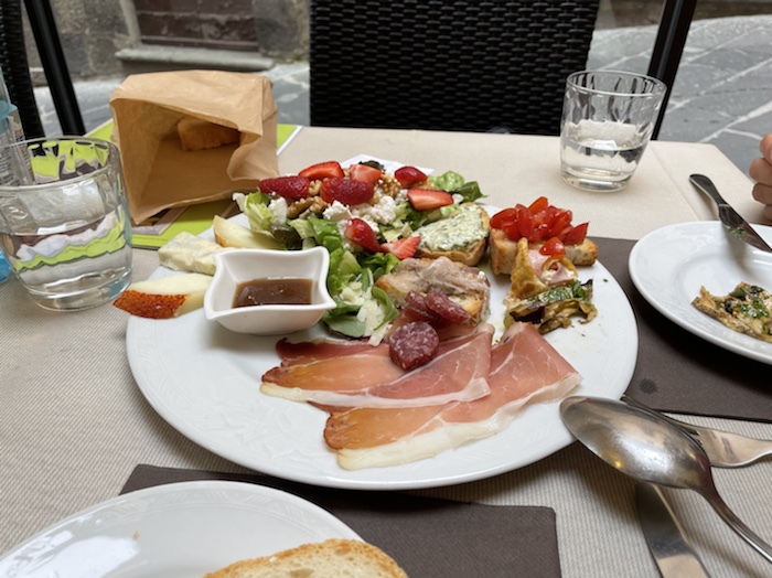 8.15 Uhr – Gerade drehte sich die Frau vor mir um und bot mir ihren Teller mit Wurst und Käse an. Sie vertrage es leider nicht. Ob ich es nehmen möge. Unglaublich. Was mir alles geschenkt wird. So habe ich jetzt zwei reich belegte Brote. Der Frau habe ich gesagt, dass ich damit bis Mailand kommen würde. Reicht aber, wenn ich heute damit versorgt bin.