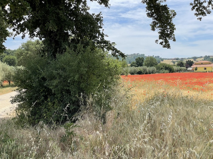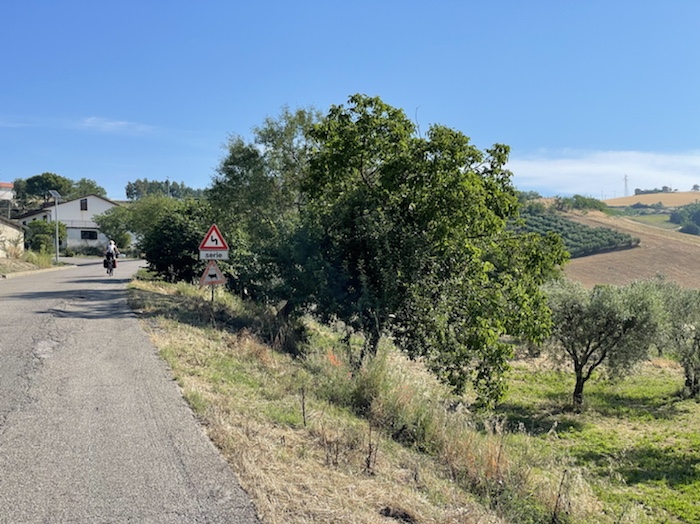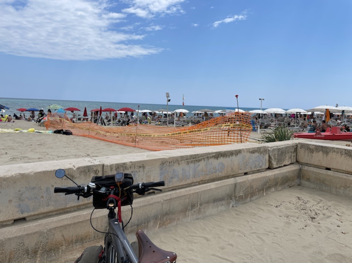11.58 Uhr – Wir fahren aus San Benedetto del Tronto hinaus. Hier spielt Ortheils Roman um die fiktive Leiterin des hiesigen Meeresmuseums. Ich stelle mir vor, wie Ich-Erzähler und Biologin hier mit dem Rad durch die Stadt fahren. Nördlich der Stadt gibt es wieder viel Naturstrand, aber in regelmäßigen Abständen Steinwälle nahe vor dem Strand, also kein freier Blick auf das offene Meer.