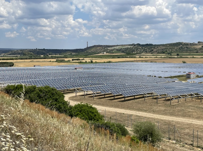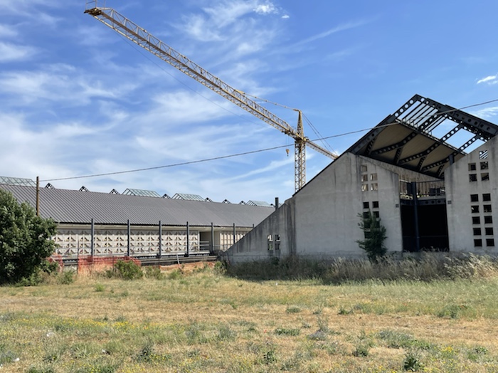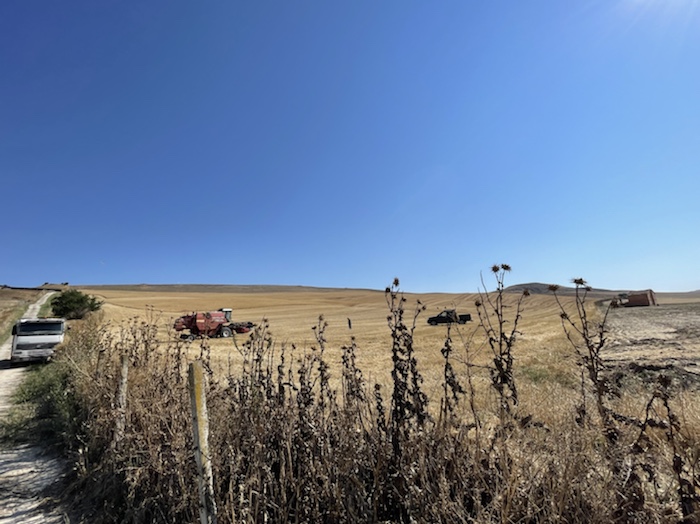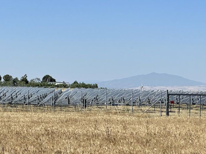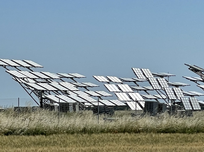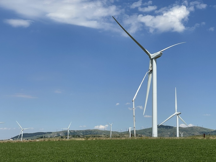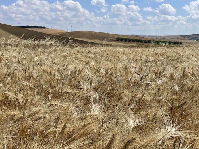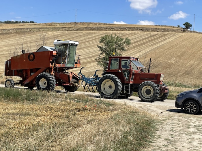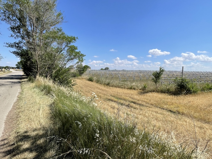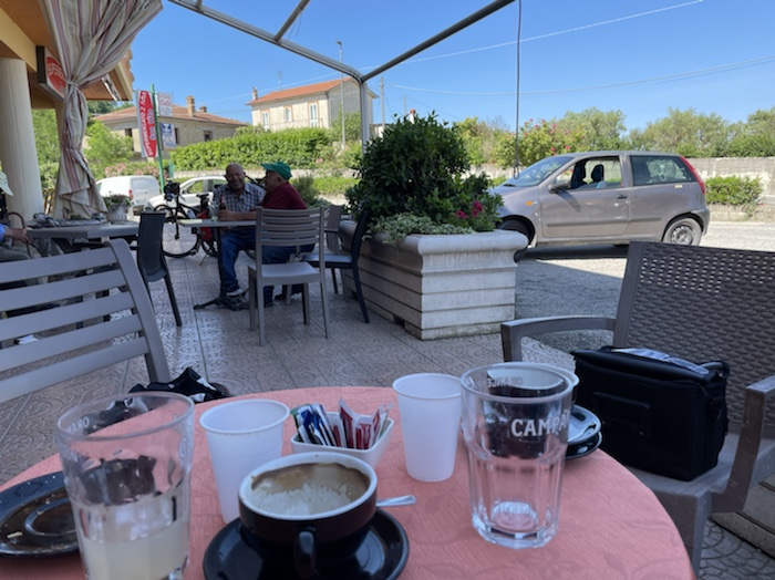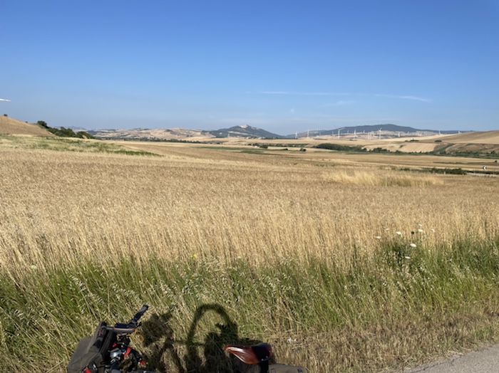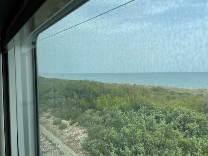 Die Strecke ist unendlich lang. Zum Glück ist in Wagen 3 auch der Kaffeeautomat. Der erste Caffé Lungo war schon sehr gut. Felder, Weinberge, Olivenplantagen ziehen endlos in dieser flachen Ebene an uns vorbei. Wie auf der 110 km Etappe von Accadia nach Barletta. Hier stehen wieder sehr viele Windräder in den Feldern.