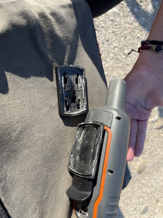 13.24 Uhr – Höhe 602 m. Ich mache einige Minuten Pause. Die Hitze vor der sonnenbeschienen Felswand ist enorm und treibt meinen Puls zusätzlich hoch. 200 Hm pro Stunden scheinen mir heute eine große Leistung. Habe zum Kühlen etwas Wasser in das von Philipp geschenkte Radkäppi geschüttet.
