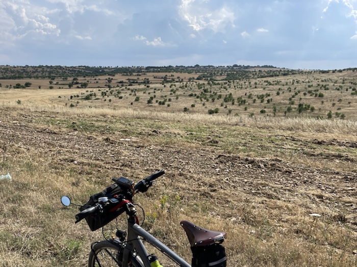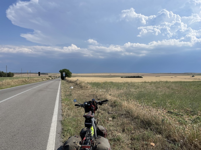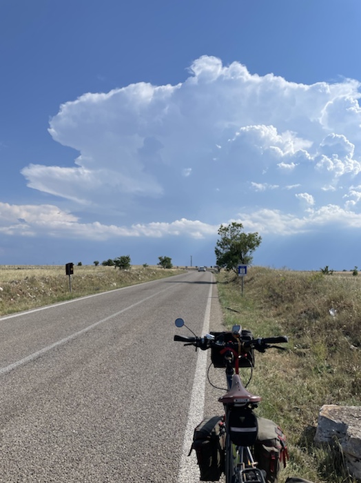 12.27 Uhr – Anderthalb Brötchen, einige Möhrenstücke von zu Hause und eine Tasse Kaffee später. Langsam sollte ich doch weiter. Eine Gewitterzelle nähert sich. Bald sollte eine Tränke auftauchen, damit ich meine Flaschen wieder füllen kann.