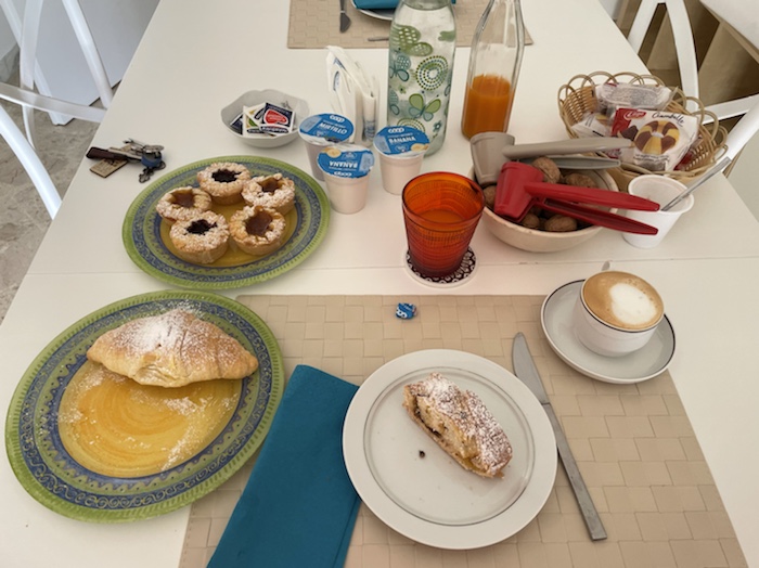 7.48 Uhr – Mit neuen Rasierklingen ist das immer so eine Sache. Inzwischen blutet der kleine Schnitt aber schon nicht mehr. Vor mir steht ein Korb mit drei Brötchen und einem Croissant. Damit habe ich fast die Tagesverpflegung, da ich morgens maximal zwei Brötchen essen kann.