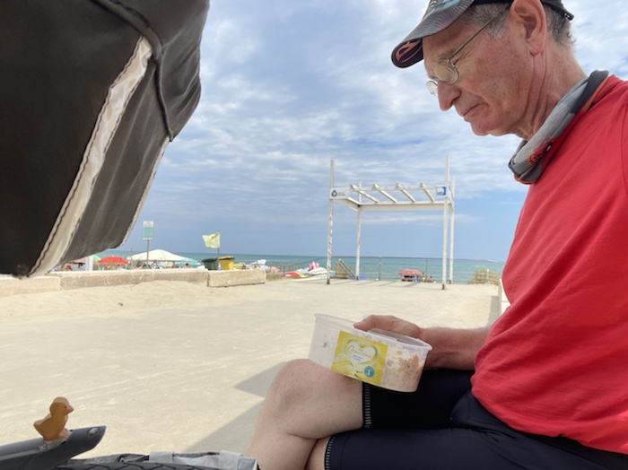 14.50 Uhr – Bis um zwölf Uhr Schlaf gefunden. Dann hat Philipp Brötchen geholt, und wir haben zusammen gefrühstückt und seine Atlantikküstenradreise besprochen.