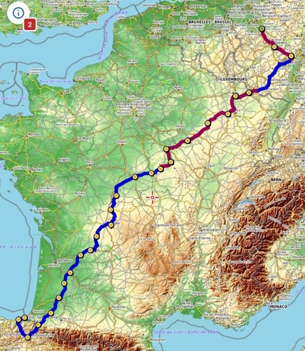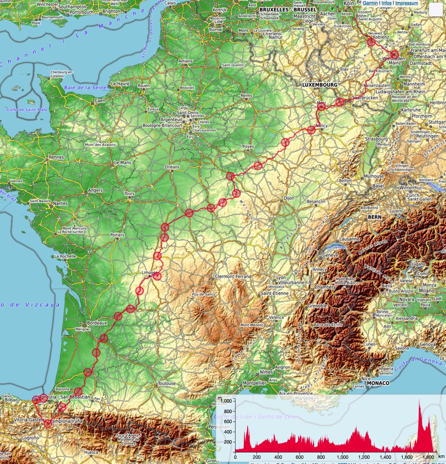 Die gesamte Strecke, ohne die Bahnfahrt von Mainz nach Saarbrücken, ist etwa 1.750 Kilometer lang, und ungefähr 15.000 Höhenmeter sind zu bewältigen. Wie man am Höhendiagramm sieht sind der Taunus am Anfang und die Pyrenäen am Ende im Grunde die größten zu überwindenden Höhenzüge. Sechsundzwanzig Fahrtage sind für die Strecke geplant, also im Schnitt 67 km pro Tag. Im ländlichen Gebiet in der Mitte Frankreichs ist eine gleichmäßige Etappenlänge wegen des eingeschränkten Übernachtungsangebots aber leider nicht immer möglich. Sie schwankt daher zwischen 38 km und 97 km pro Tag.
