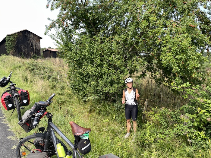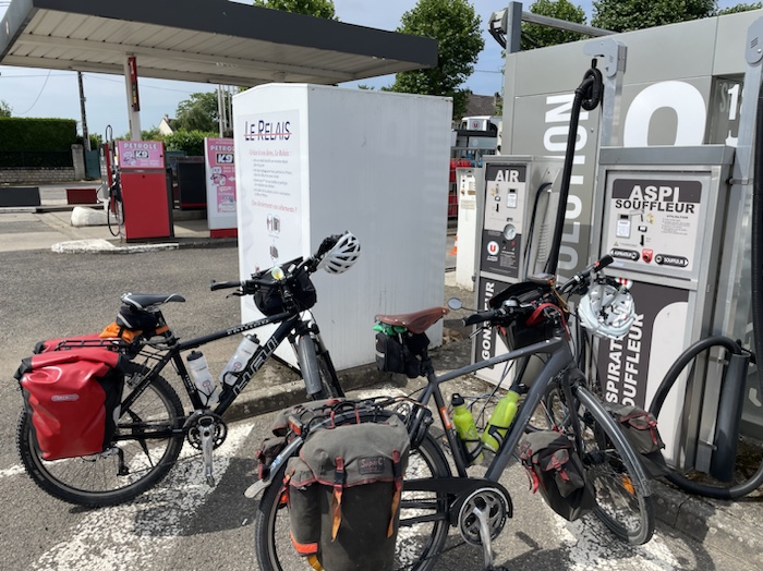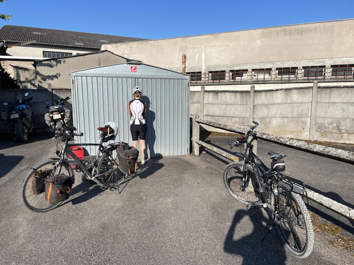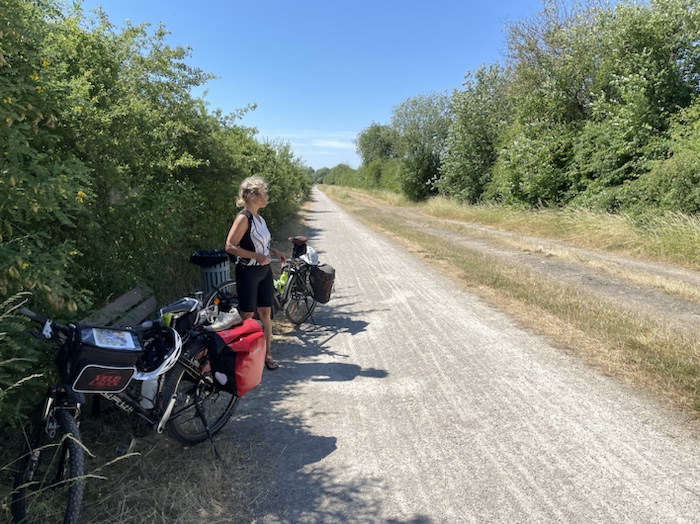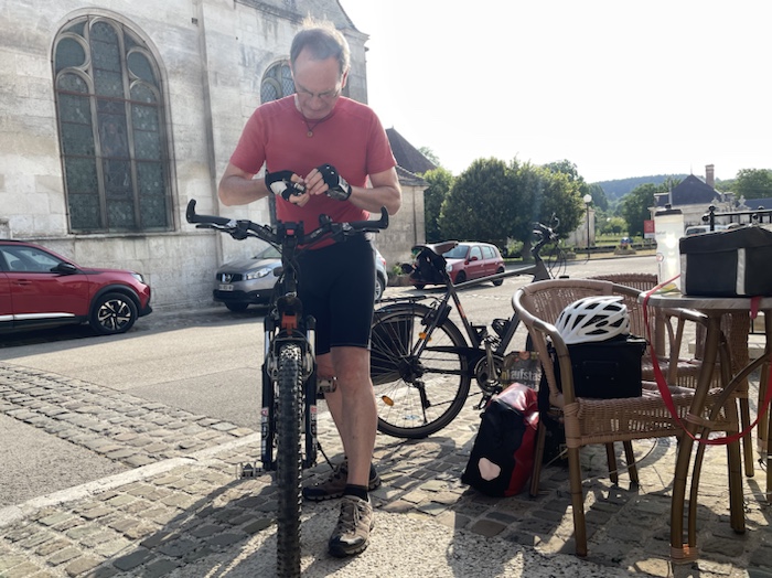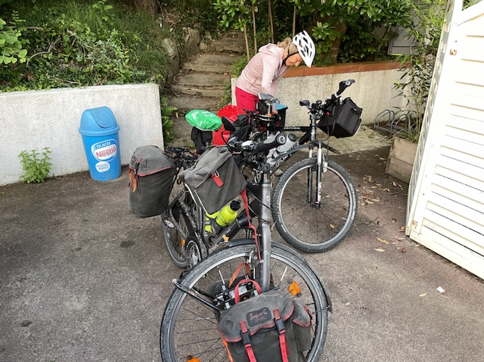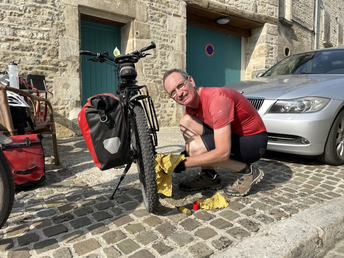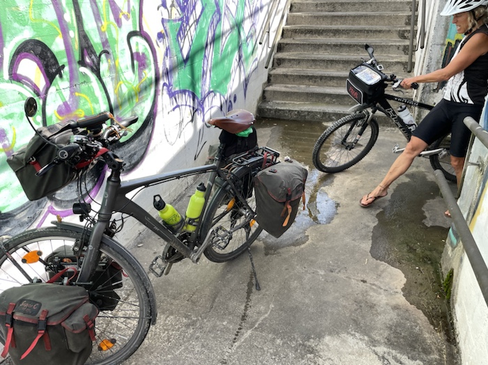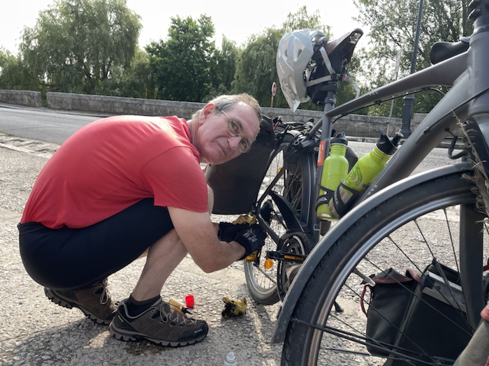 Diesmal hatte Martina einen Platten, der aber schnell behoben war. Ihre Schaltung musste neu eingestellt werden. Wir haben ihren Lenkervorbau nochmal umgestellt und dadurch ihre Hände und den Nacken weiter entlastet. Die Anbringung der Ortlieb-Taschen war lange nicht optimal, und das Einhängen kompliziert. Vielleicht lässt sich da zu Hause noch etwas verbessern. Ihre Akkulampe passte nicht mehr an den Lenker, da müsste beim nächsten Mal eine andere Lösung gefunden werden. Vielleicht wäre eine Handy-Halterung auch nicht schlecht, damit sie auch mal streckenweise vorne fahren kann.