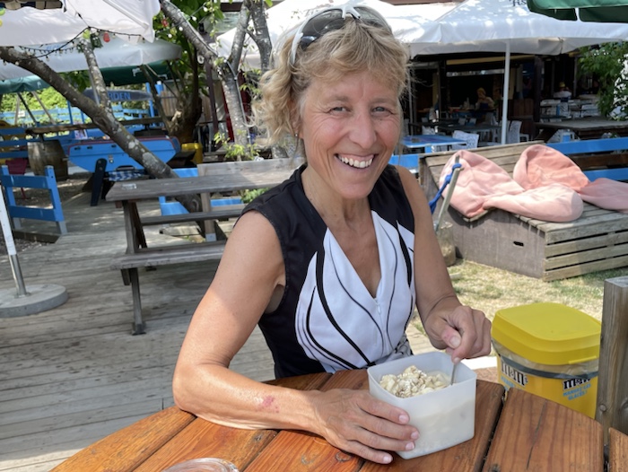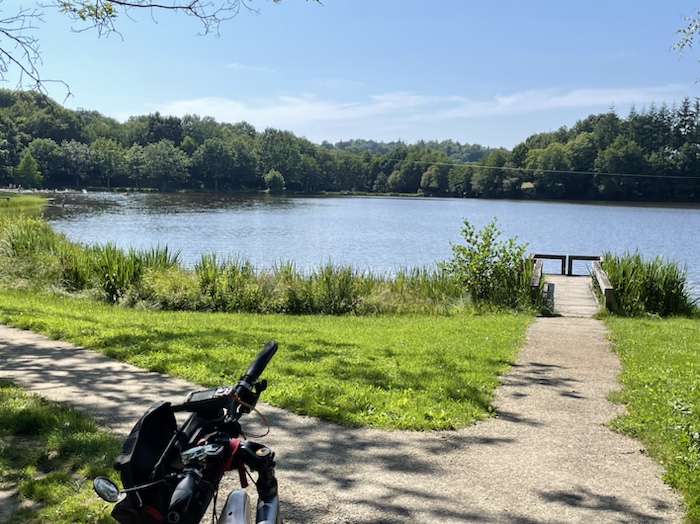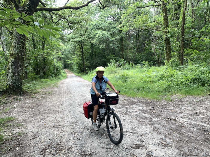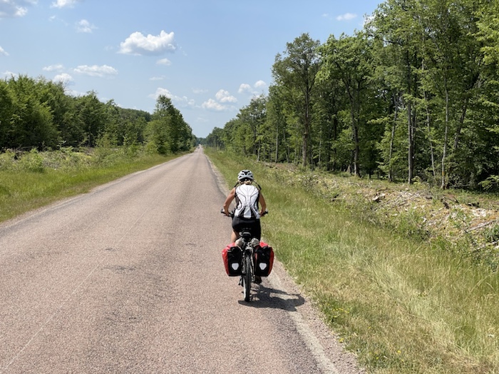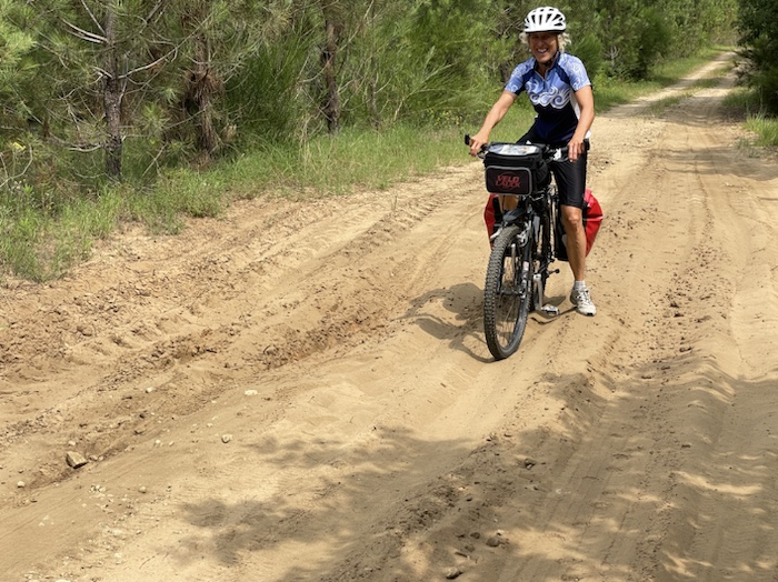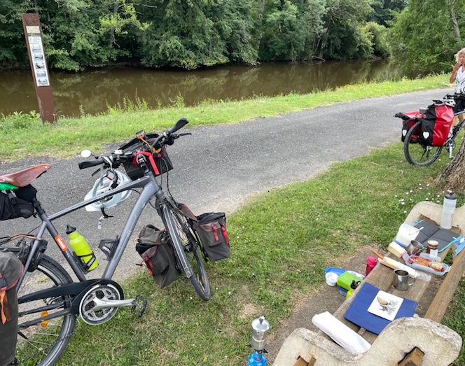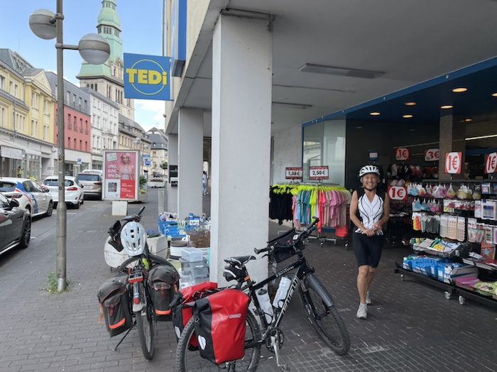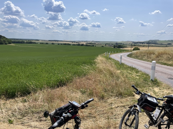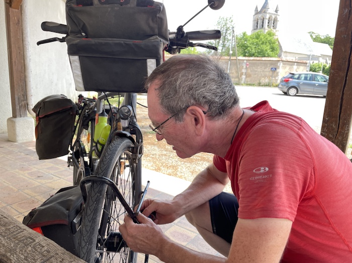 Diesmal hatte Martina einen Platten, der aber schnell behoben war. Ihre Schaltung musste neu eingestellt werden. Wir haben ihren Lenkervorbau nochmal umgestellt und dadurch ihre Hände und den Nacken weiter entlastet. Die Anbringung der Ortlieb-Taschen war lange nicht optimal, und das Einhängen kompliziert. Vielleicht lässt sich da zu Hause noch etwas verbessern. Ihre Akkulampe passte nicht mehr an den Lenker, da müsste beim nächsten Mal eine andere Lösung gefunden werden. Vielleicht wäre eine Handy-Halterung auch nicht schlecht, damit sie auch mal streckenweise vorne fahren kann.