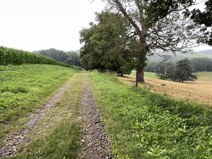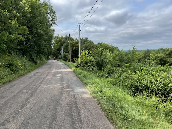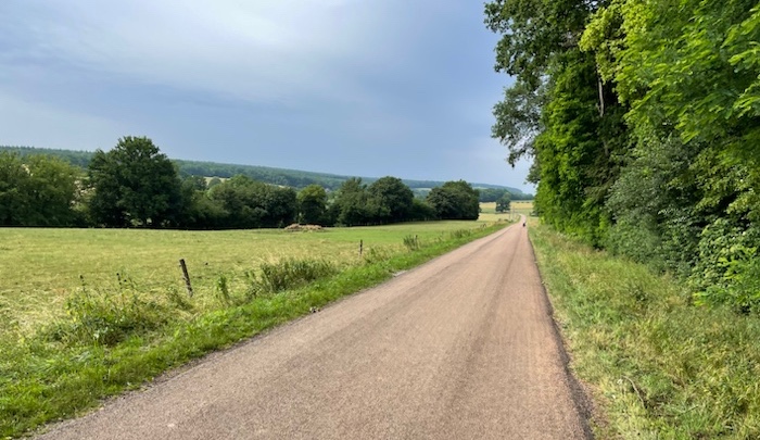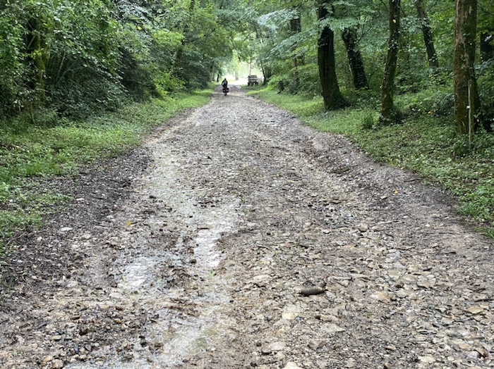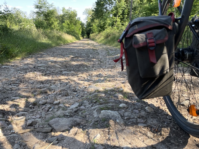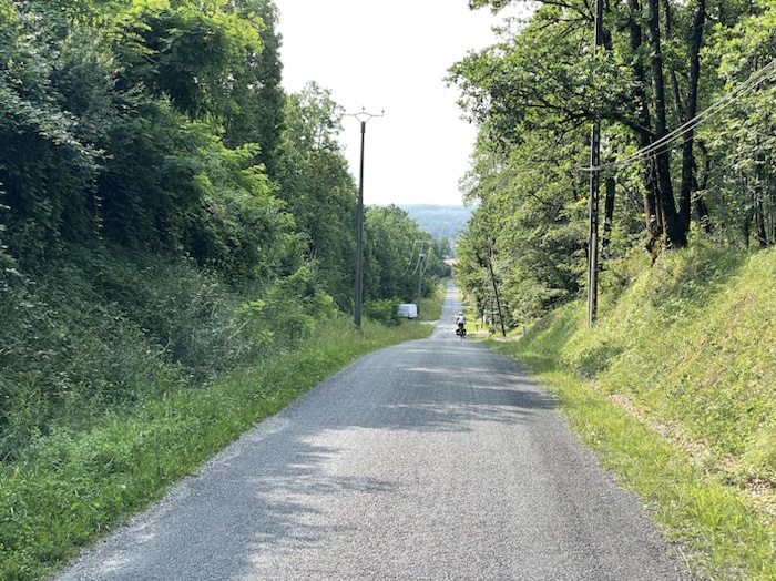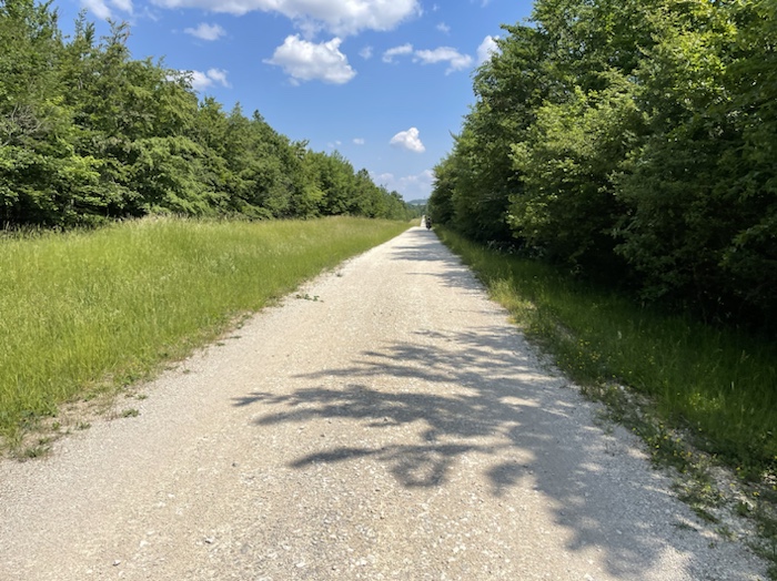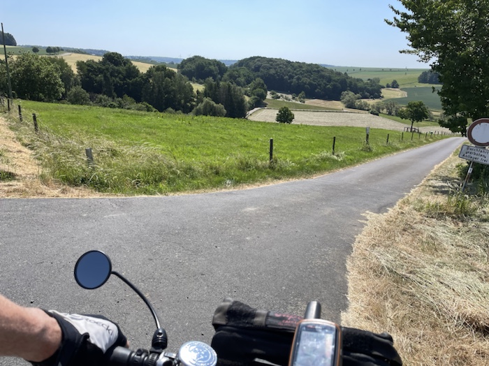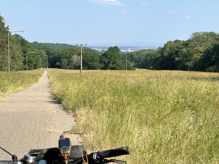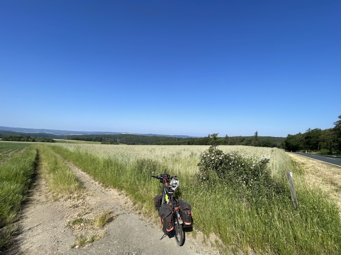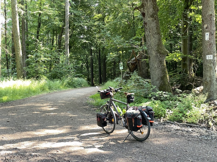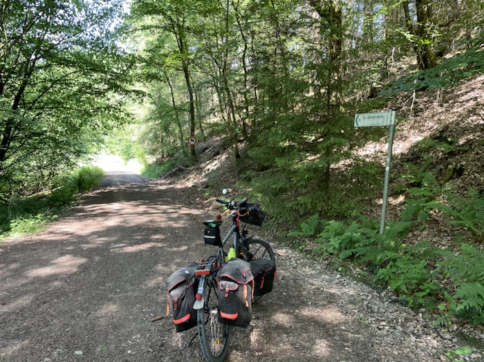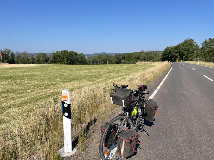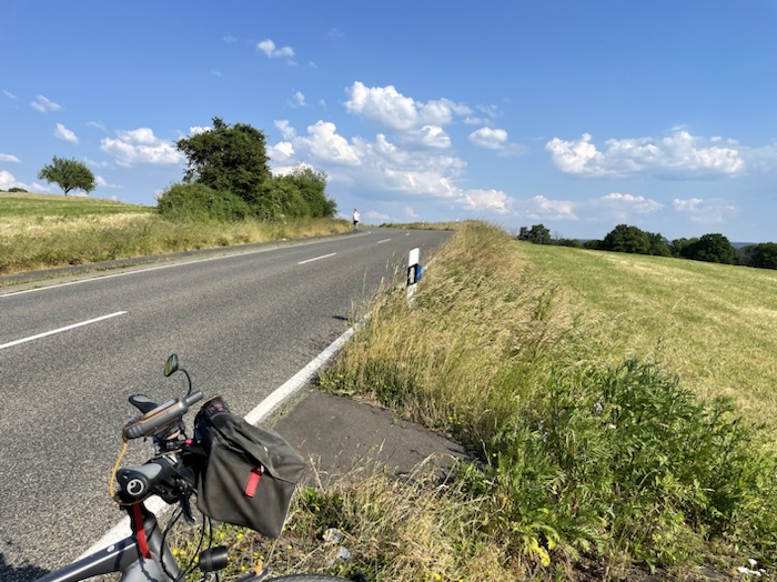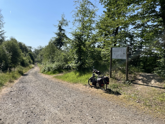 10.05 Uhr – Auf dem Limes-Radweg. Ich musste schon die erste 14 %-Steigung auf Schotterpiste nehmen. Jetzt kommt eine längere Abfahrt.