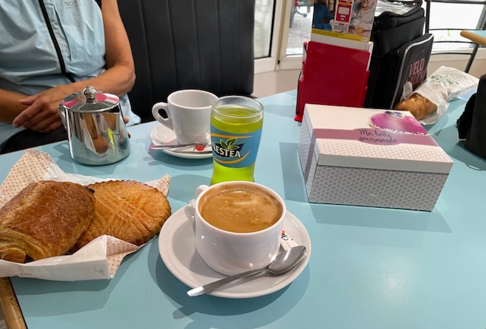 Zwischenmahlzeit mit Müsli und zwei Pain-au-Chocolat aus Paris.