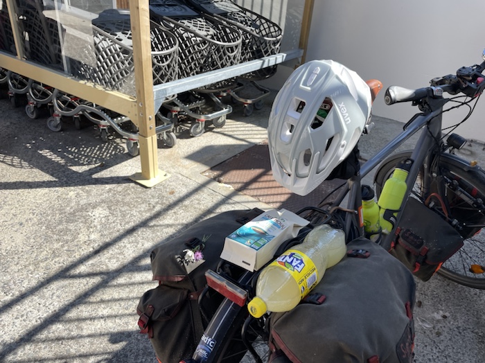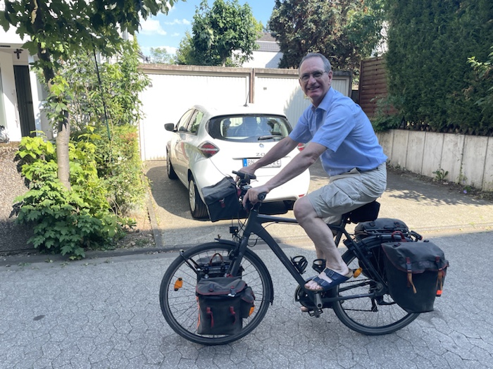 Probefahrt ohne Helm, aber mit allem Gepäck. Inklusive Wasser und Verpflegung sind es fast 23 kg. Kommt mir echt viel vor. Aber nun gut, ich will ja weder auf den Fön noch auf den Kaffeekocher verzichten.