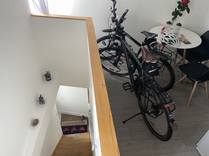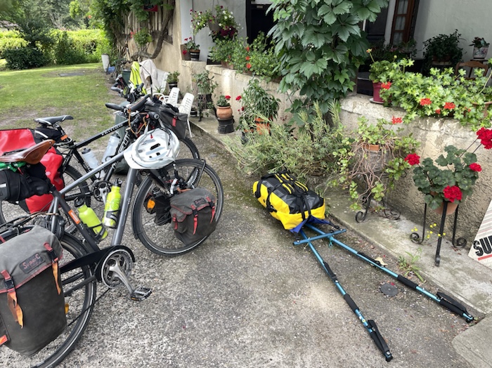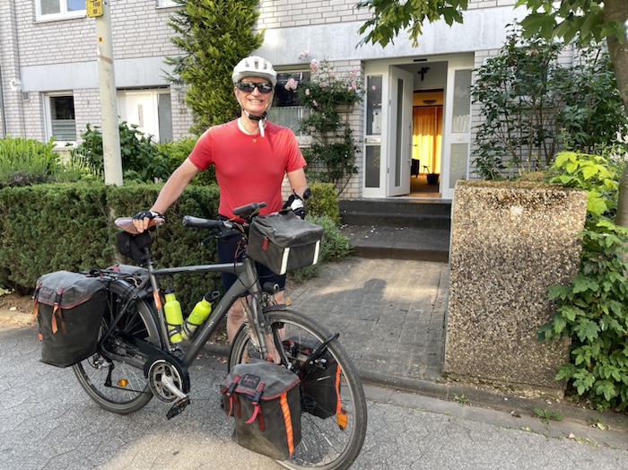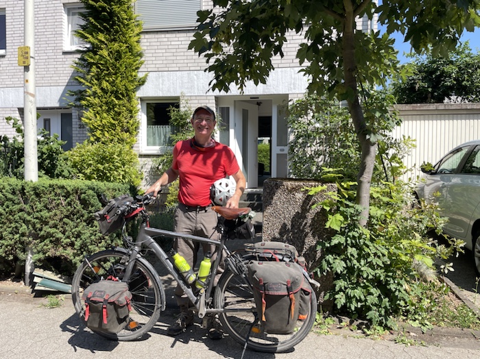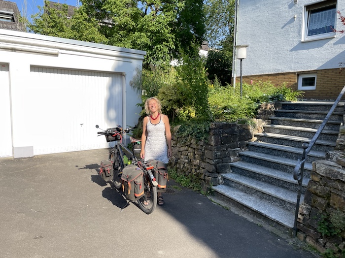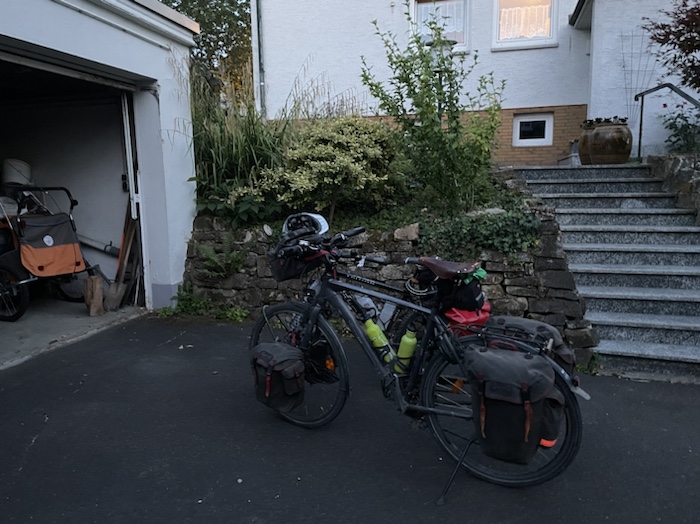 Das Fahrrad steht schon bepackt in der Garage, nur Verpflegungstüte und Übernachtungstasche habe ich gestern nochmal abgenommen.