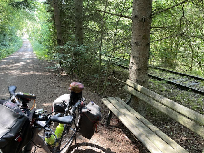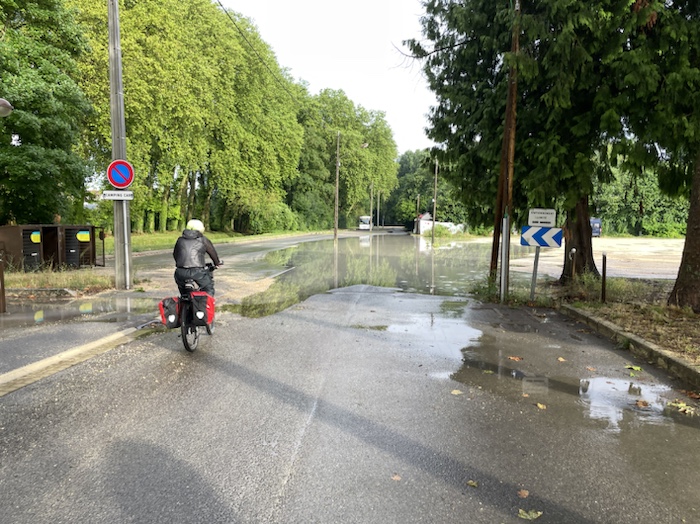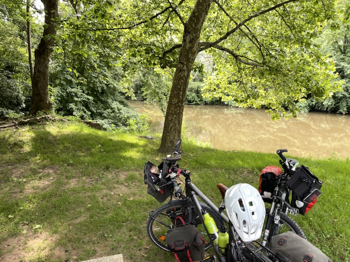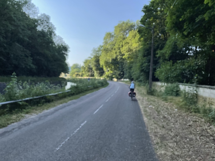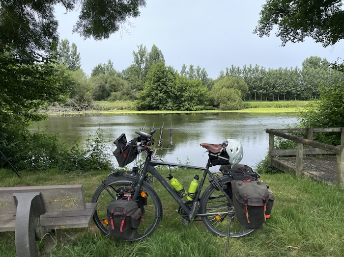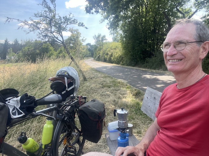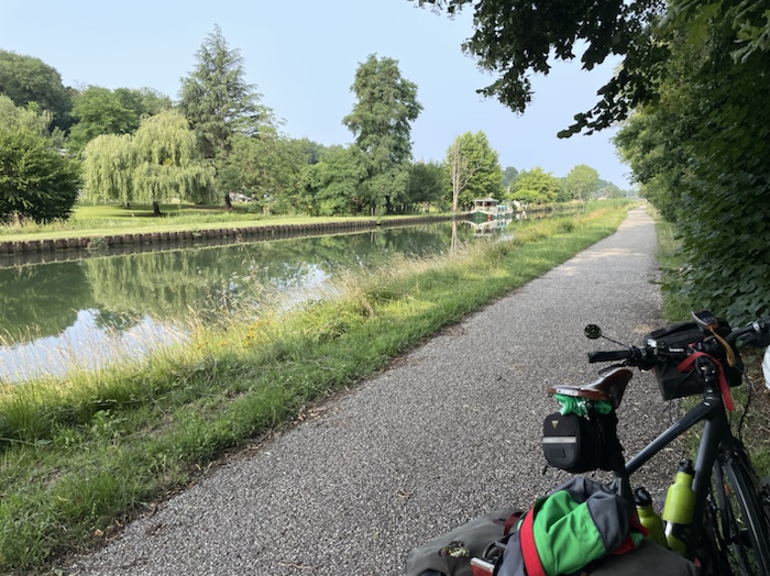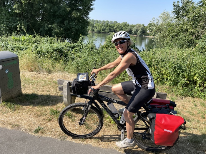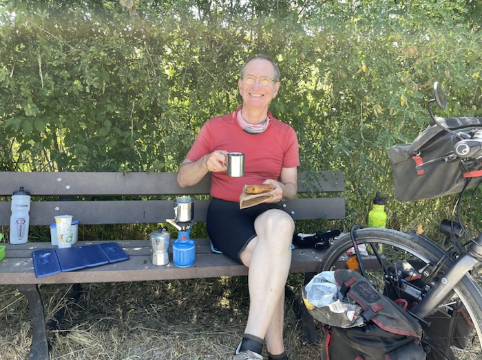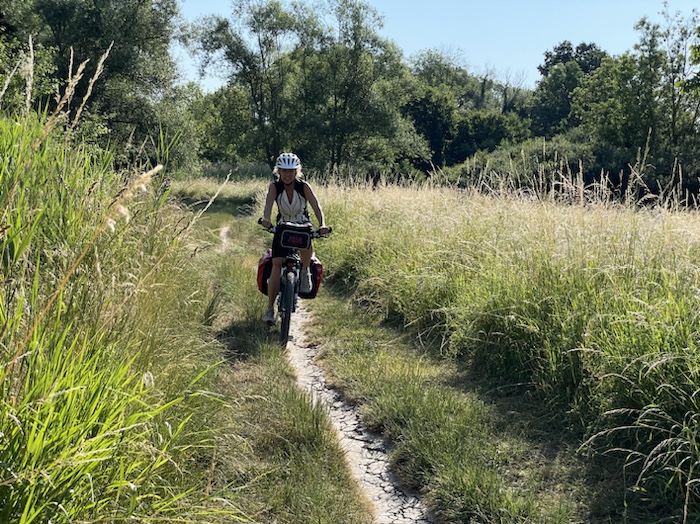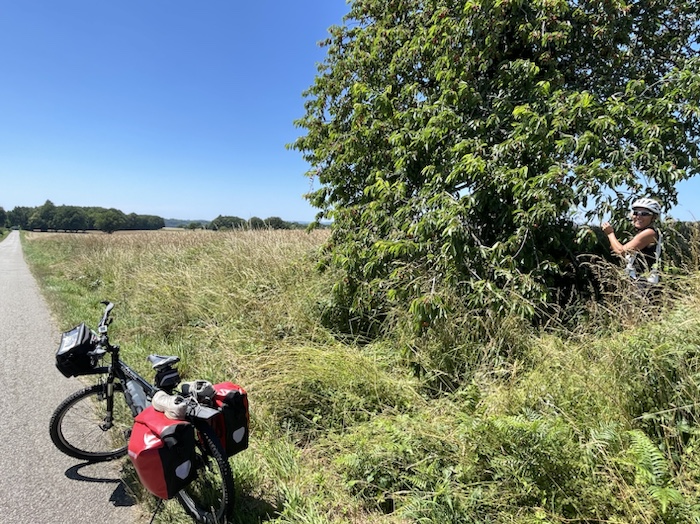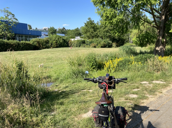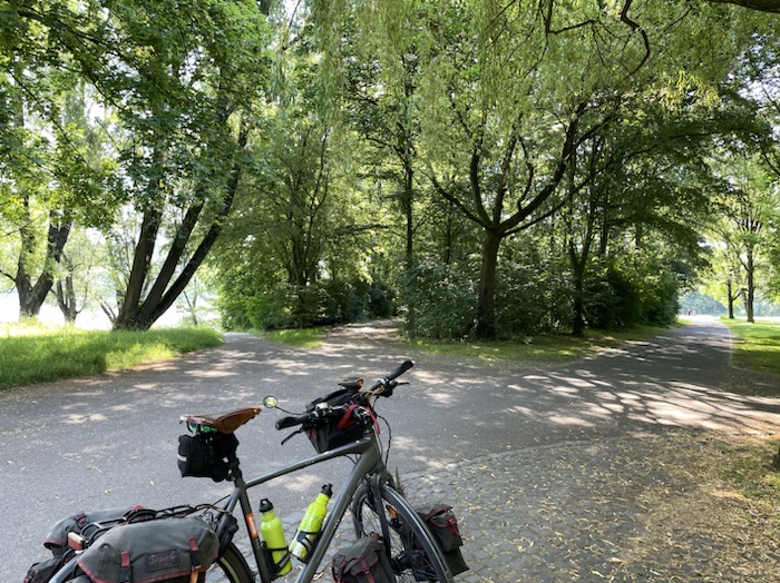 9.53 Uhr – In den Rheinauen. Das Klappern vorne rechts nervt. Wahrscheinlich ist es wieder einmal der Deckel der Cafetière. Also habe ich etwas umsortiert. Es rollt gut, etwas schwer, aber gemütlich.