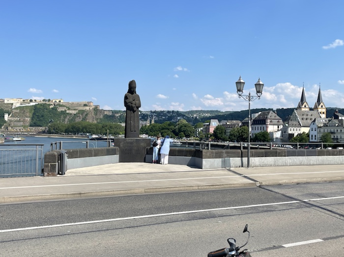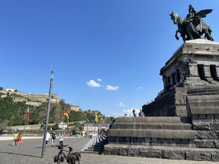 15.46 Uhr – Kilometer 67. Auf der Moselbrücke in Koblenz: voraus das Deutsche Eck und die Festung Ehrenbreitstein, rechts die Altstadt. Hoffentlich gibt es dort Kuchen!