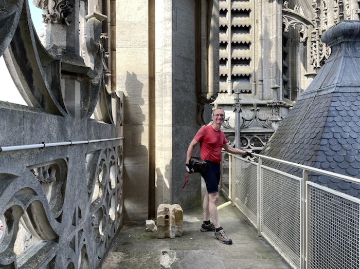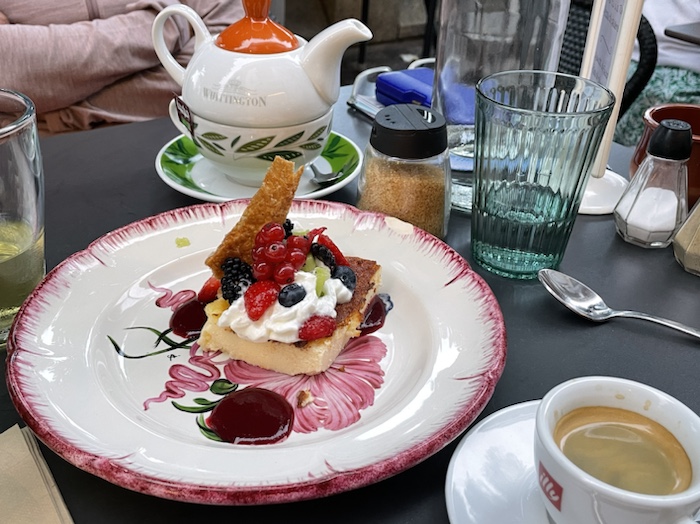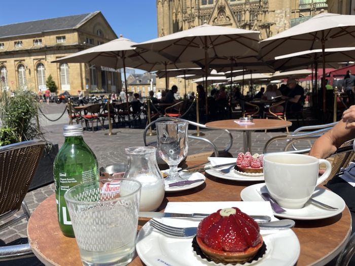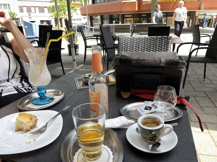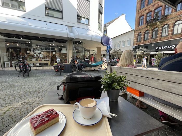 16.06 Uhr – Geht doch! Ich sitze unterhalb der Liebfrauenkirche in der Altstadt. Der Erdbeerkuchen war sehr lecker, hätte von mir sein können.