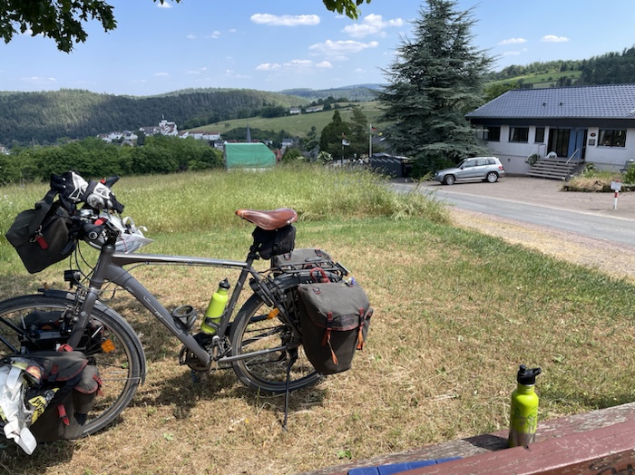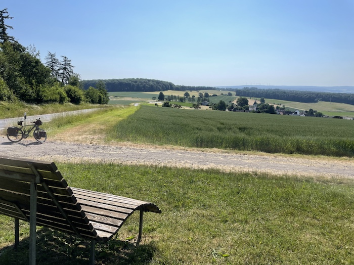 15.04 Uhr – Kilometer 46, nach 829 Höhenmetern. Ich mache Rast oberhalb von Bad Schwalbach, esse die Brote von gestern und heute Morgen. Die Apfelstücke und die Rohkost von gestern sind auch noch gut zu essen.