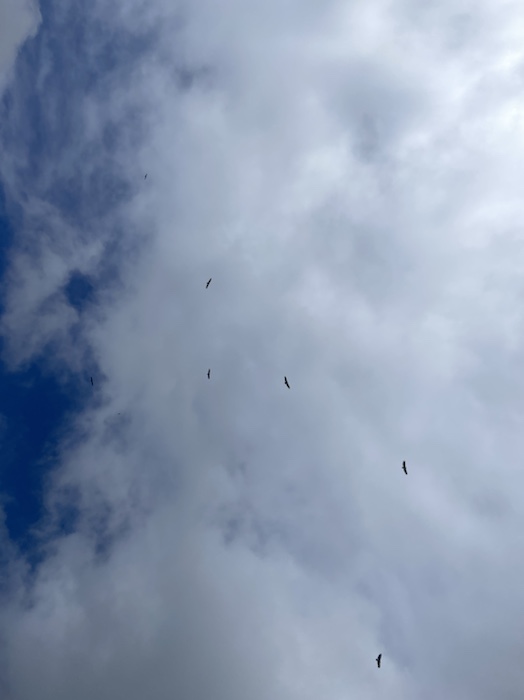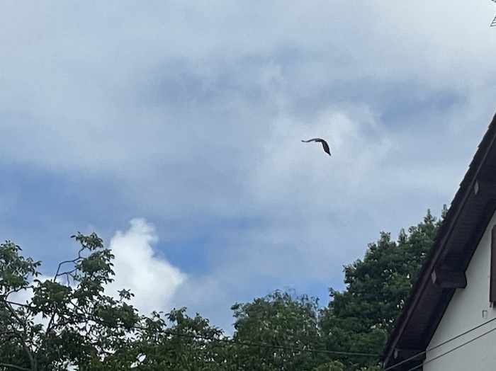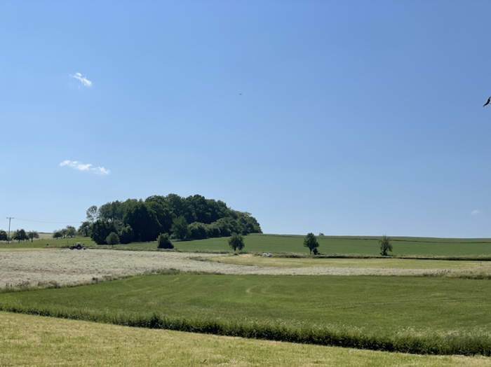 11.22 Uhr – Fünf Milane kreisen hier bei Hunzel tief über den Heuwiesen auf der Suche nach Beute. Wie unsichtbar zwitschern ohne Pause kleinen Lerchen irgendwo über mir.