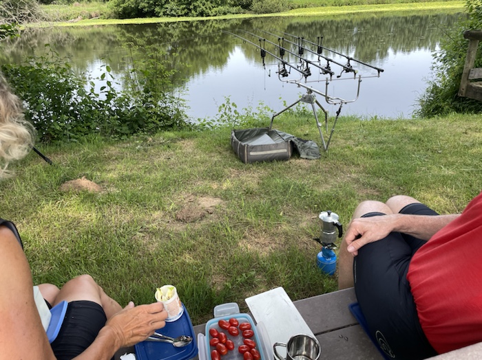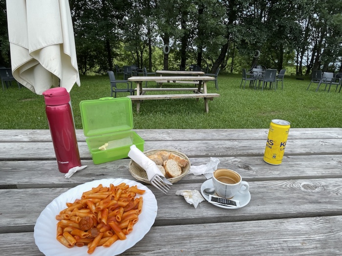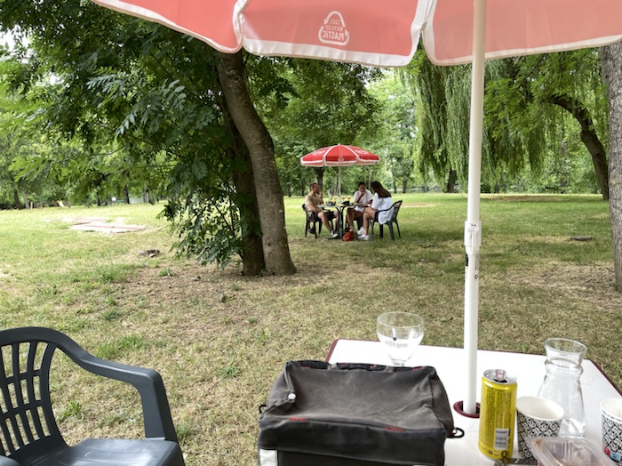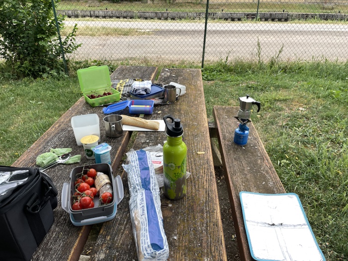 13.47 Uhr – Auf der Bank unter den Platanen war es zum Kaffeekochen einfach zu windig. Ich habe Brote und Rohkost gegessen. Als Nachschlag gibt es leider nicht den erhofften Kuchen, aber Apfelschorle und Kaffee.
