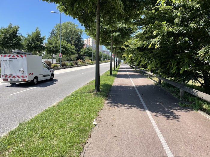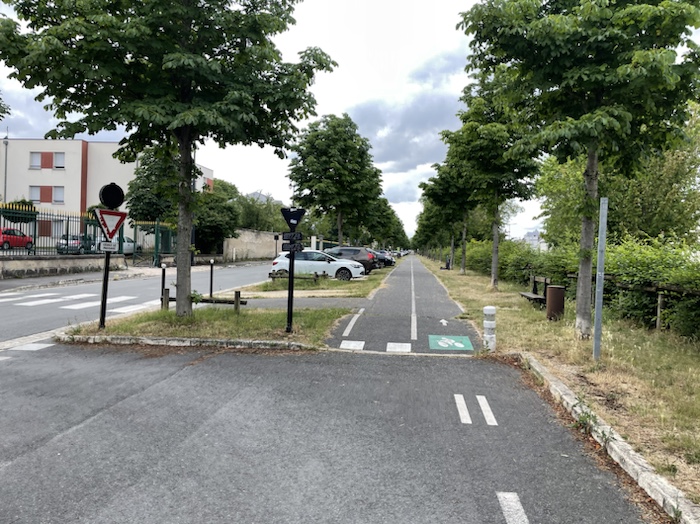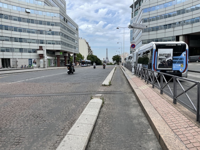 Ein geschützter Radstreifen, sehr schmal aber erstmal gemütlich zu fahren. Vorne ist schon der Eiffelturm.