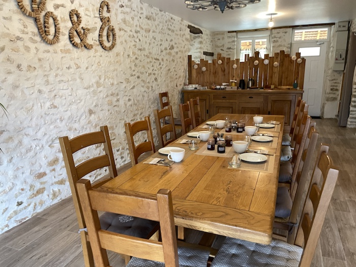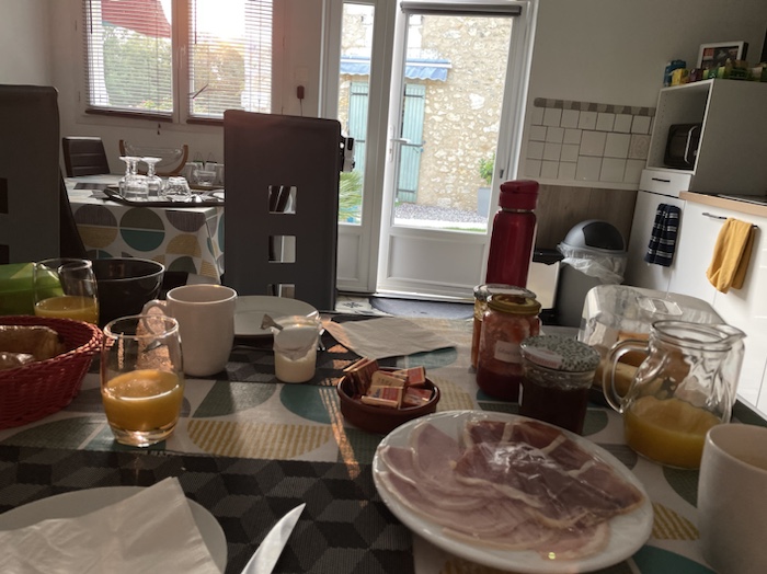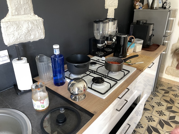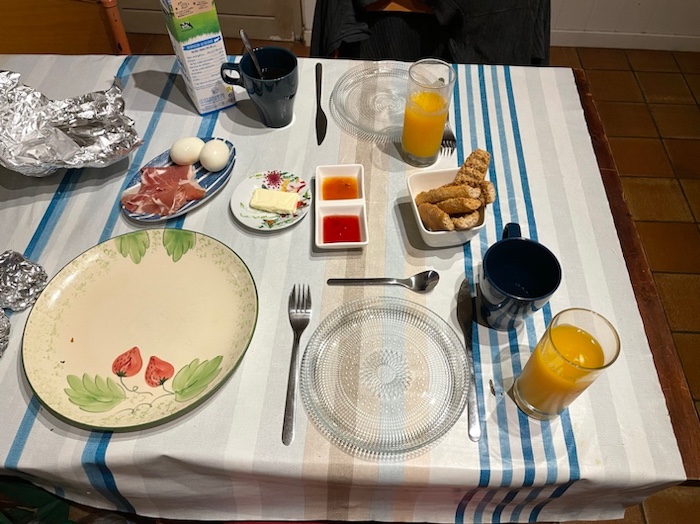 Die Vermieterin hat mir vier Fotos geschickt von den Sachen, die sie uns für das Frühstück bereitgestellt hat. Unter anderem steht die Cafetière schon fertig auf dem Herd.