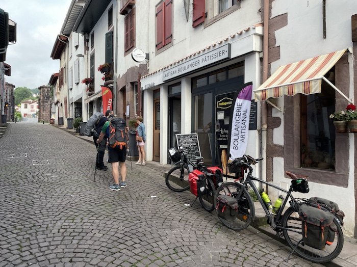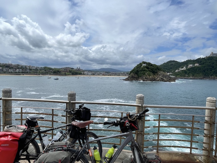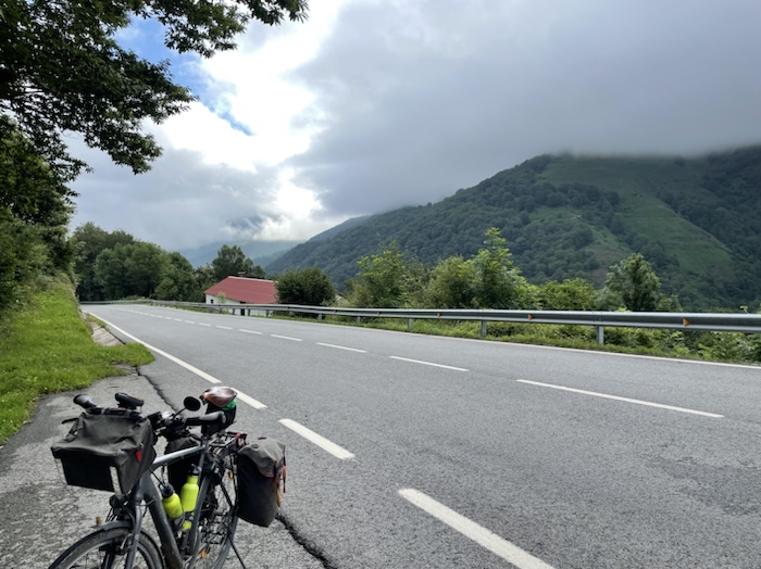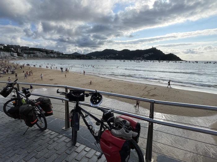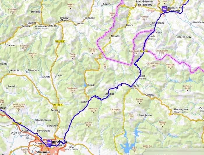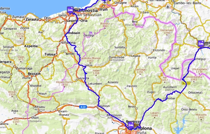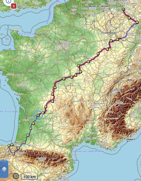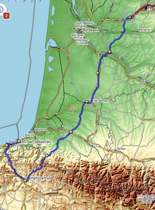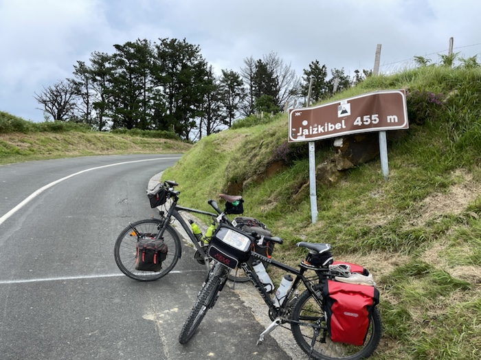 Ab Saint-Jean-Pied-de-Port, wo drei der Hauptpilgerrouten zusammenlaufen, können wir dem EuroVelo 3 folgen, der uns auf dem Camino Francés über einen Pass nach Roncevalles und weiter nach Pamplona bringt. Dort verlassen wir die Santiago-Pilger und radeln auf einer alten Bahntrasse mit langen Tunneln nach Norden auf San Sebastián zu. Am Atlantik soll ein Ruhetag eingelegt werden, bevor es von Hendaye mit dem Zug über Bordeaux zurück nach Wiesbaden geht.