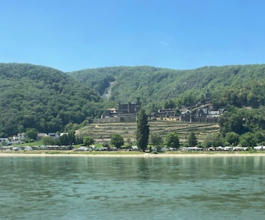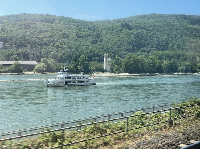 13.08 Uhr – Am Mäuseturm in Bingen. Jetzt läuft die Klimaanlage. Heute ist wirklich ideales Wetter für Schiffsausflüge.
