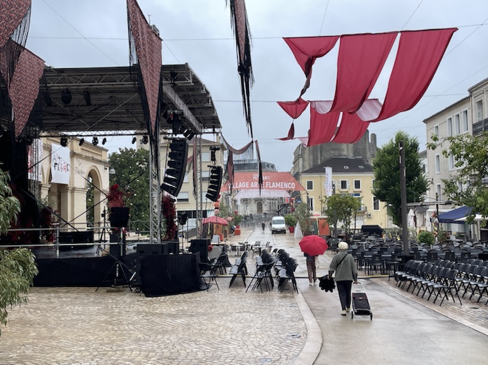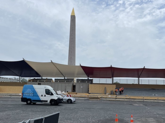 Entlang des Boulevards und hier an der Place-de-la-Concord sind schon die Tribünen für den 14. Juli aufgebaut.