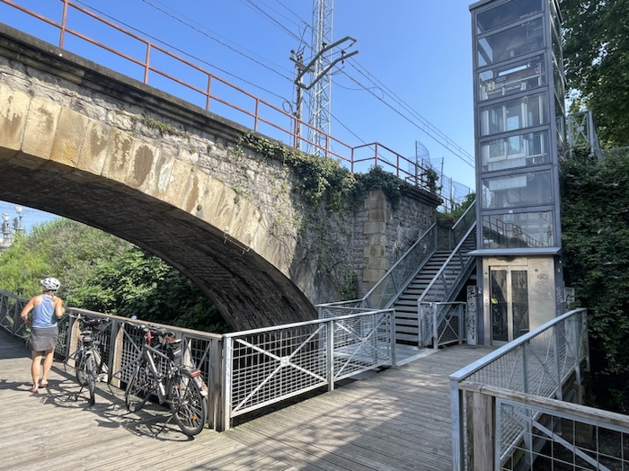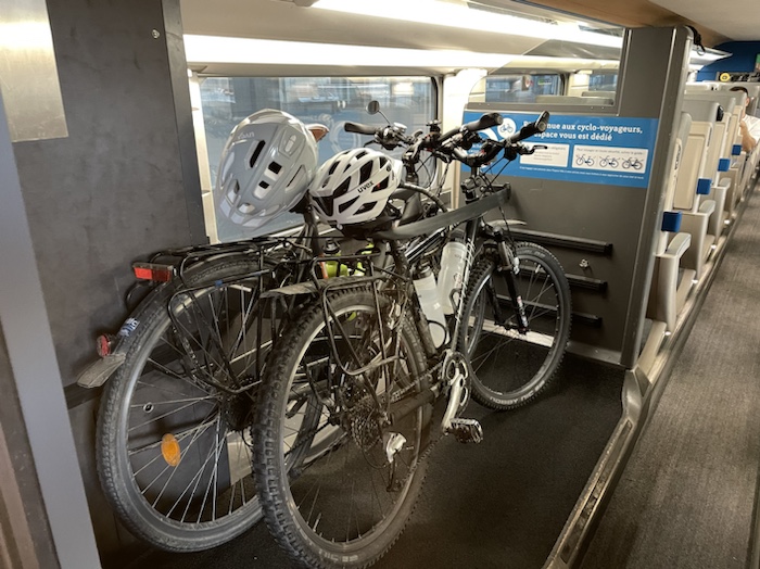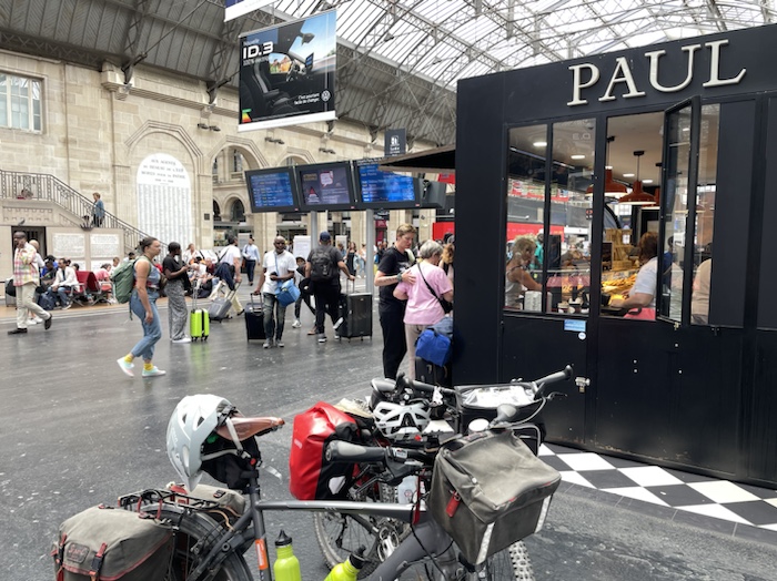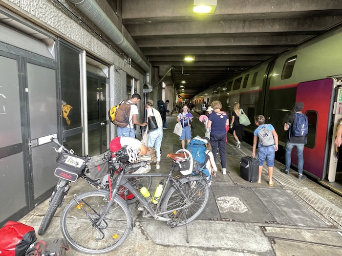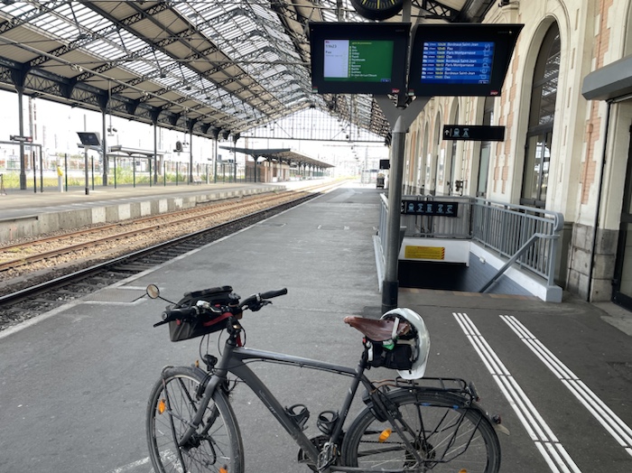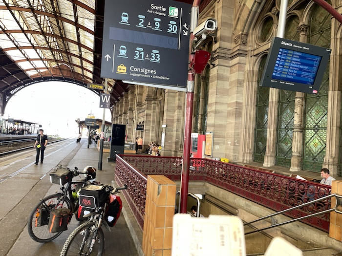 Klar, der TGV fährt immer von Gleis 1, nur halt heute nicht. Also schleppen wir die schweren Räder die Treppen runter und rauf, da es keine Aufzüge gibt.