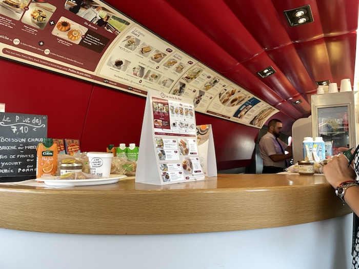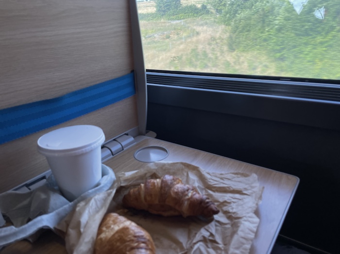 14.26 Uhr – Kaffee, Baguette und Croissants und Limonade sind gekauft. Jetzt haben wir ein paar Minuten Zeit, bis wir zum plötzlich angezeigten Gleis werden rennen müssen.