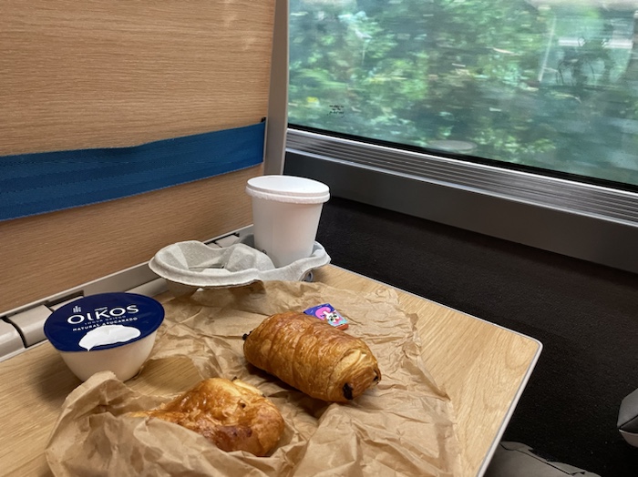 Kaffee holen beim freundlichen Bistro-Mitarbeiter. Noch ist der Zug fast leer.