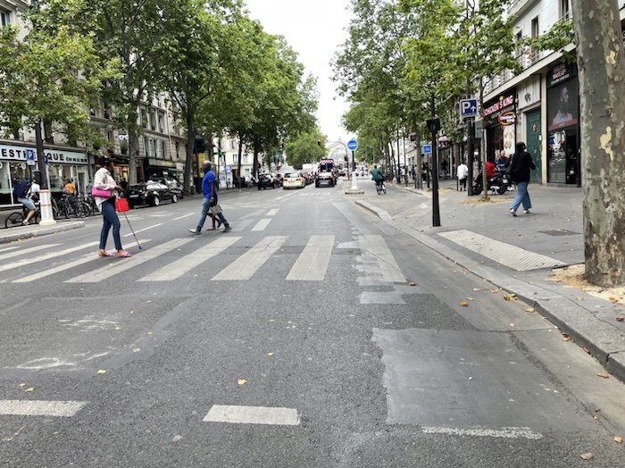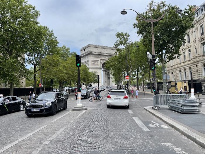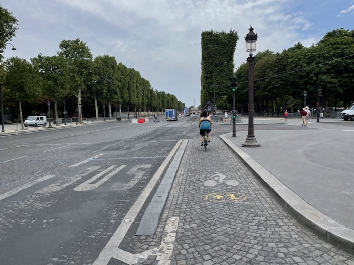 Auf den Champs-Élysée. Auf den etwas breiteren Radspuren werden wir oft ziemlich eng überholt. Ampeln an Zebrastreifen werden meist überfahren, an Einmündung tendenziell nicht.