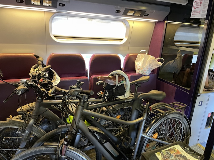 Hier im Fahrradabteil der alten Machart ist gerade Platz für zwei Räder, würde ich sagen, aber es stehen vier hier. Einen Sicherungsgurt habe ich nicht gefunden. Also habe ich meinen eigenen ausgepackt und alle vier Räder gesichert.