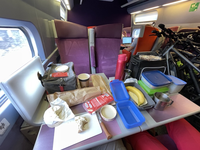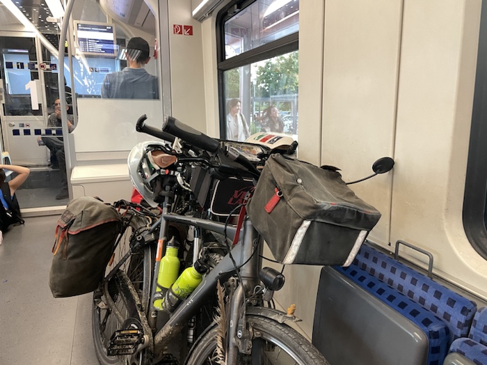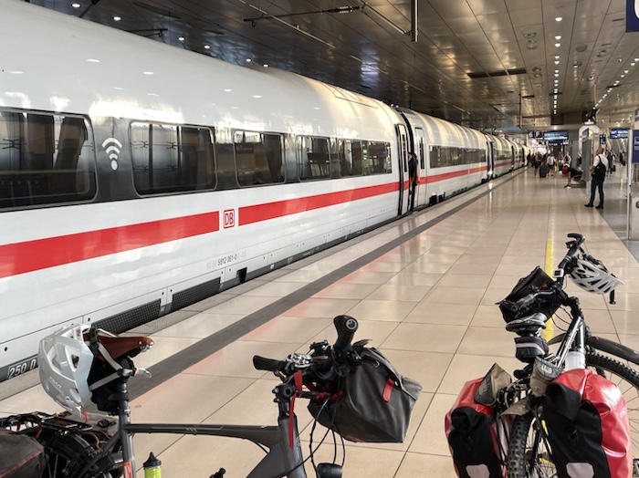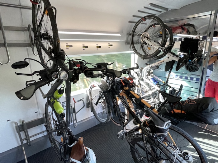 18.37 Uhr – Doch nur zwei Minuten Verspätung, mit einem sehr netten jungen Schaffner und einer sauberen funktionierenden Toilette auf der es sogar Papierhandtücher gibt. Das Einhängen der Räder und Umladen der Taschen hat etwa zehn Minuten gedauert. Da laut Schaffner keine weiteren Räder mehr kommen, konnte ich den senkrechten Platz bekommen, wo der Low-Rider für die Vorderradtaschen nicht an der Aufhängung hängen bleibt.