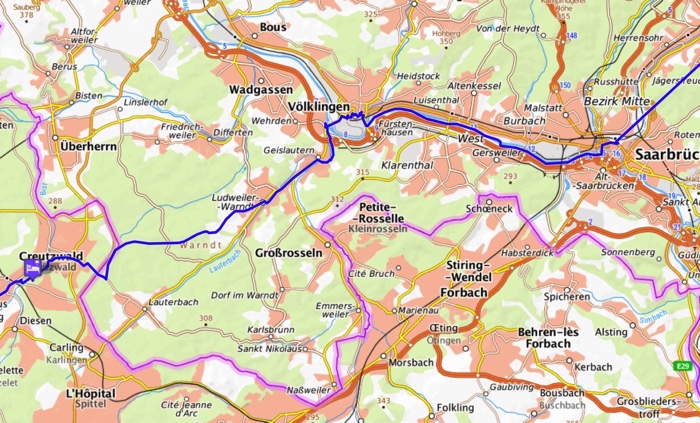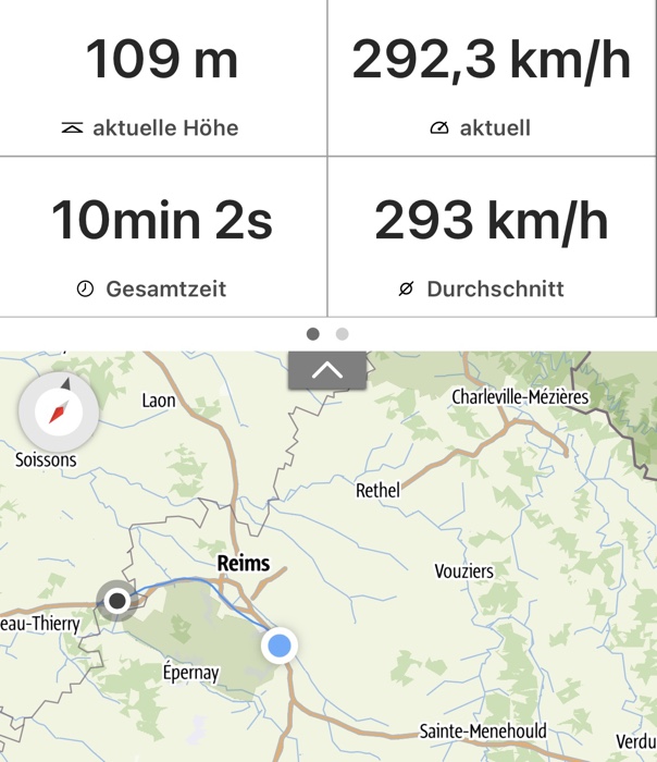 15.38 Uhr – Wir rasen mit fast dreihundert km/h an Reims vorbei. In den alten Wagons sind die Scheiben nicht so stark bedampft, daher ist der GPS-Empfang hier besser und man kann die Strecke gut auf OutdoorActive mitverfolgen.